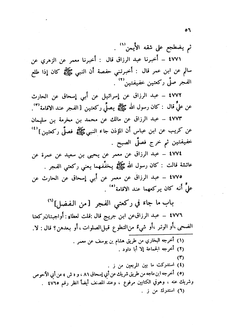 4771 - عَبْدُ الرَّزَّاقِ، قَالَ: أَخْبَرَنَا مَعْمَرٌ، عَنِ الزُّهْرِيِّ، عَنْ سَالِمٍ، عَنِ ابْنِ عُمَرَ قَالَ: أَخْبَرَتْنِي حَفْصَةُ أَنَّ النَّبِيَّ صَلَّى اللهُ عَلَيْهِ وَسَلَّمَ كَانَ إِذَا §طَلَعَ الْفَجْرُ صَلَّى رَكْعَتَيْنِ خَفِيفَتَيْنِ "