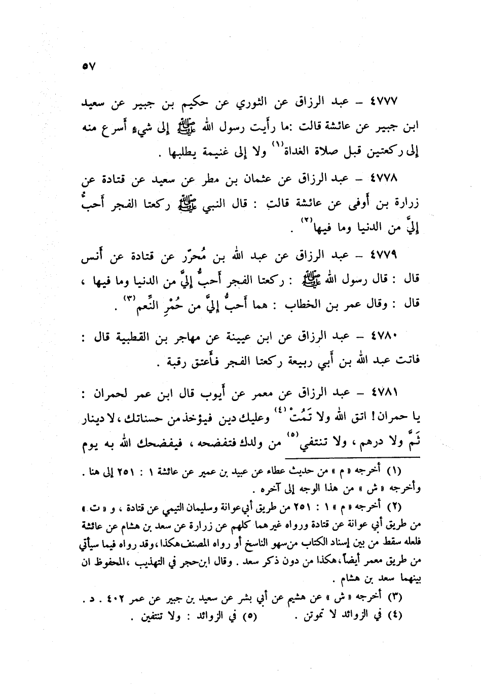 4778 - عَنْ عُثْمَانَ بْنِ مَطَرٍ، عَنْ سَعِيدٍ، عَنْ قَتَادَةَ، عَنْ زُرَارَةَ بْنِ أَوْفَى، عَنْ عَائِشَةَ قَالَتْ: قَالَ النَّبِيُّ صَلَّى اللهُ عَلَيْهِ وَسَلَّمَ: «§رَكْعَتَا الْفَجْرِ أَحَبُّ إِلَيَّ مِنَ الدُّنْيَا وَمَا فِيهَا»