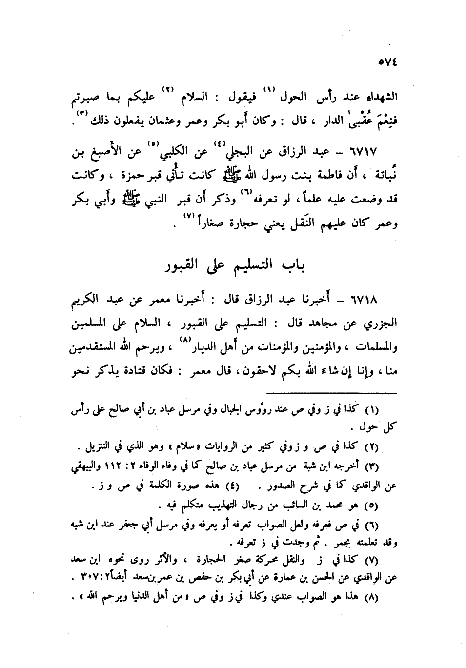 6718 - عَبْدُ الرَّزَّاقِ قَالَ: أَخْبَرَنَا مَعْمَرٌ، عَنْ عَبْدِ الْكَرِيمِ الْجَزَرِيِّ، عَنْ مُجَاهِدٍ قَالَ: " التَّسْلِيمُ عَلَى الْقُبُورِ: §السَّلَامُ عَلَى الْمُسْلِمِينَ وَالْمُسْلِمَاتِ، وَالْمُؤْمِنِينَ وَالْمُؤْمِنَاتِ مِنْ أَهْلِ الدِّيَارِ، وَيَرْحَمُ اللَّهُ الْمُسْتَقْدِمِينَ مِنَّا، وَإِنَّا إِنْ شَاءَ اللَّهُ بِكُمْ لَاحِقُونَ ". قَالَ مَعْمَرٌ: فَكَانَ قَتَادَةُ يَذْكُرُ نَحْوَ هَذَا وَيَزِيدُ: أَنْتُمْ لَنَا فَرَطًا وَنَحْنُ لَكُمْ تَبَعٌ، وَإِنَّا إِنْ شَاءَ اللَّهُ بِكُمْ لَلَاحِقُونَ