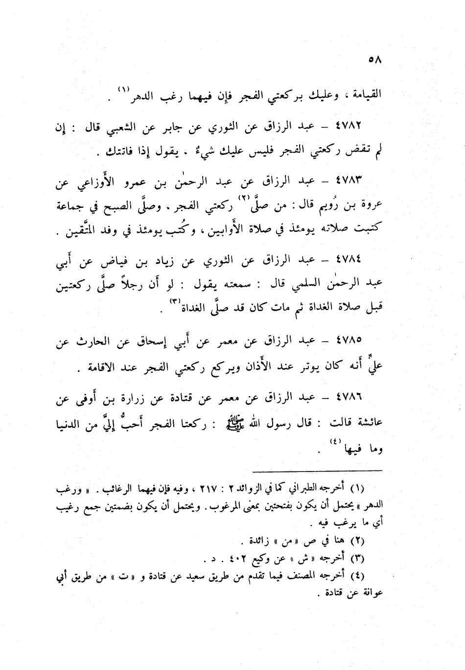 4786 - عَنْ مَعْمَرٍ، عَنْ قَتَادَةَ، عَنْ زُرَارَةَ بْنِ أَوْفَى، عَنْ عَائِشَةَ قَالَتْ: قَالَ رَسُولُ اللَّهِ صَلَّى اللهُ عَلَيْهِ وَسَلَّمَ: «§رَكْعَتَا الْفَجْرِ أَحَبُّ إِلَيَّ مِنَ الدُّنْيَا وَمَا فِيهَا»