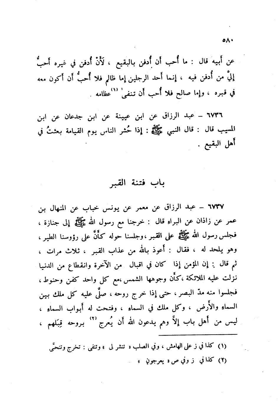 6737 - عَنْ مَعْمَرٍ، عَنْ يُونُسَ بْنِ خَبَّابٍ، عَنِ الْمِنْهَالِ بْنِ عُمَرَ، عَنْ زَاذَانَ، عَنِ الْبَرَاءِ قَالَ: خَرَجْنَا مَعَ رَسُولِ اللَّهِ صَلَّى اللهُ عَلَيْهِ وَسَلَّمَ إِلَى جِنَازَةٍ فَجَلَسَ رَسُولُ اللَّهِ صَلَّى اللهُ عَلَيْهِ وَسَلَّمَ عَلَى الْقَبْرِ وَجَلَسْنَا حَوْلَهُ كَأَنَّ عَلَى رُءُوسِنَا الطَّيْرُ، وَهُوَ يَلْحَدُ لَهُ، فَقَالَ: «أَعُوذُ بِاللَّهِ مِنْ عَذَابِ الْقَبْرِ، ثَلَاثَ مَرَّاتٍ»، ثُمَّ قَالَ: " إِنَّ §الْمُؤْمِنَ إِذَا كَانَ فِي إِقْبَالٍ مِنَ الْآخِرَةِ وَانْقِطَاعٍ مِنَ الدُّنْيَا نَزَلَتْ عَلَيْهِ الْمَلَائِكَةُ كَأَنَّ وُجُوهَهَا الشَّمْسُ مَعَ كُلِّ وَاحِدٍ كَفَنٌ وَحَنُوطٌ، فَجَلَسُوا مِنْهُ مَدَّ الْبَصَرِ حَتَّى إِذَا خَرَجَ رُوحُهُ صَلَّى عَلَيْهِ كُلُّ مَلَكٍ بَيْنَ السَّمَاءِ وَالْأَرْضِ وَكُلُّ مَلَكٍ فِي السَّمَاءِ، وَفُتِحَتْ لَهُ أَبْوَابُ السَّمَاءِ لَيْسَ مِنْ أَهْلِ بَابٍ إِلَّا وَهُمْ يَدْعُونَ اللَّهَ أَنْ يُعْرَجَ بِرُوحِهِ قِبَلَهُمْ -[581]-، فَإِذَا عُرِجَ بِرُوحِهِ قِبَلَهُمْ قَالُوا: أَيْ رَبِّ، عَبْدُكَ فُلَانٌ، فَيَقُولُ: أَرْجِعُوهُ فَإِنِّي عَهِدْتُ إِلَيْهِمْ أَنِّي مِنْهَا خَلَقْتُهُمْ، وَفِيهَا نُعِيدُهُمْ وَمِنْهَا نُخْرِجُهُمْ تَارَةً أُخْرَى، فَإِنَّهُ يَسْمَعُ خَفْقَ نِعَالِ أَصْحَابِهِ إِذَا وَلَّوْا عَنْهُ، فَيَأْتِيهِ آتٍ فَيَقُولُ: مَنْ رَبُّكَ؟ مَا دِينُكَ؟ مَنْ نَبِيُّكَ؟ فَيَقُولُ: رَبِّيَ اللَّهُ، وَدِينِيَ الْإِسْلَامُ، وَنَبِيِّي مُحَمَّدٌ عَلَيْهِ السَّلَامُ، فَيَنْتَهِرُهُ فَيَقُولُ: مَنْ رَبُّكَ؟ وَمَا دِينُكَ؟ وَمَنْ نَبِيُّكَ؟ وَهِيَ آخِرُ فِتْنَةٍ تُعْرَضُ عَلَى الْمُؤْمِنِ فَذَلِكَ حِينَ يَقُولُ: {يُثَبِّتُ اللَّهُ الَّذِينَ آمَنُوا بِالْقَوْلِ الثَّابِتِ فِي الْحَيَاةِ الدُّنْيَا وَفِي الْآخِرَةِ} [إبراهيم: 27] فَيَقُولُ: رَبِّيَ اللَّهُ، وَدِينِيَ الْإِسْلَامُ، وَنَبِيِّي مُحَمَّدٌ عَلَيْهِ السَّلَامُ، فَيَقُولُ لَهُ: صَدَقْتَ، ثُمَّ يَأْتِيَهِ آتٍ حَسَنُ الْوَجْهِ طَيِّبُ الرِّيحِ حَسَنُ الثِّيَابِ، فَيَقُولُ لَهُ: أَبْشِرْ بِكَرَامَةٍ مِنَ اللَّهِ وَنُعَيْمٍ مُقِيمٍ، فَيَقُولُ: أَنْتَ بَشَّرَكَ اللَّهُ بِخَيْرٍ مَنْ أَنْتَ؟ فَيَقُولُ: أَنَا عَمَلُكَ الصَّالِحُ، كُنْتَ وَاللَّهِ سَرِيعًا فِي طَاعَةِ اللَّهِ بَطِيئًا فِي مَعْصِيَةِ اللَّهِ فَجَزَاكَ اللَّهُ خَيْرًا، ثُمَّ يُفْتَحُ لَهُ بَابٌ مِنَ الْجَنَّةِ وَبَابٌ مِنَ النَّارِ، فَيُقَالُ: هَذَا مَنْزِلُكَ لَوْ عَصَيْتَ اللَّهَ أَنْزَلَكَ اللَّهُ بِهِ هَذَا، فَإِذَا رَأَى مَا فِي الْجَنَّةِ قَالَ: رَبِّ عَجِّلْ قِيَامَ السَّاعَةِ، كَيْمَا أَرْجِعَ إِلَى أَهْلِي وَمَالِي، فَيُقَالُ: اسْكُنْ، وَإِنَّ الْكَافِرَ إِذَا كَانَ فِي انْقِطَاعٍ مِنَ الدُّنْيَا وَإِقْبَالٍ مِنَ الْآخِرَةِ نَزَلَتْ إِلَيْهِ مَلَائِكَةٌ غِلَاظٌ شَدَّادٌ يَنْتَزِعُونَ رُوحَهُ كَمَا يُنْتَزَعُ السَّفُّودُ الْكَبِيرُ الشِّعْبِ مِنَ الصُّوفِ الْمُبْتَلِّ وَيُنْتَزَعُ نَفْسُهُ مَعَ الْعُرُوقِ، فَإِذَا خَرَجَ رُوحُهُ لَعَنَهُ كُلُّ مَلَكٍ بَيْنَ السَّمَاءِ وَالْأَرْضِ وَكُلُّ مَلَكٍ فِي السَّمَاءِ، وَتُغْلَقُ أَبْوَابُ السَّمَاءِ، لَيْسَ أَهْلُ بَابٍ إِلَّا وَهُمْ يَدْعُونَ أَنْ لَا يُعْرَجَ بِرُوحِهِ قِبَلَهُمْ -[582]-، فَإِذَا عُرِجَ بِرُوحِهِ قَالُوا: رَبَّنَا هَذَا عَبْدُكَ فُلَانٌ، فَيَقُولُ: أَرْجِعُوهُ إِنِّي عَهِدْتُ إِلَيْهِمْ أَنِّي مِنْهَا خَلَقْتُهُمْ، وَفِيهَا أُعِيدُهُمْ، وَمِنْهَا أُخْرِجُهُمْ تَارَةً أُخْرَى قَالَ: فَإِنَّهُ يَسْمَعُ خَفْقَ نِعَالِ أَصْحَابِهِ إِذَا وَلَّوْا عَنْهُ، فَيَأْتِيهِ آتٍ فَيَقُولُ: مَنْ رَبُّكَ؟ وَمَا د