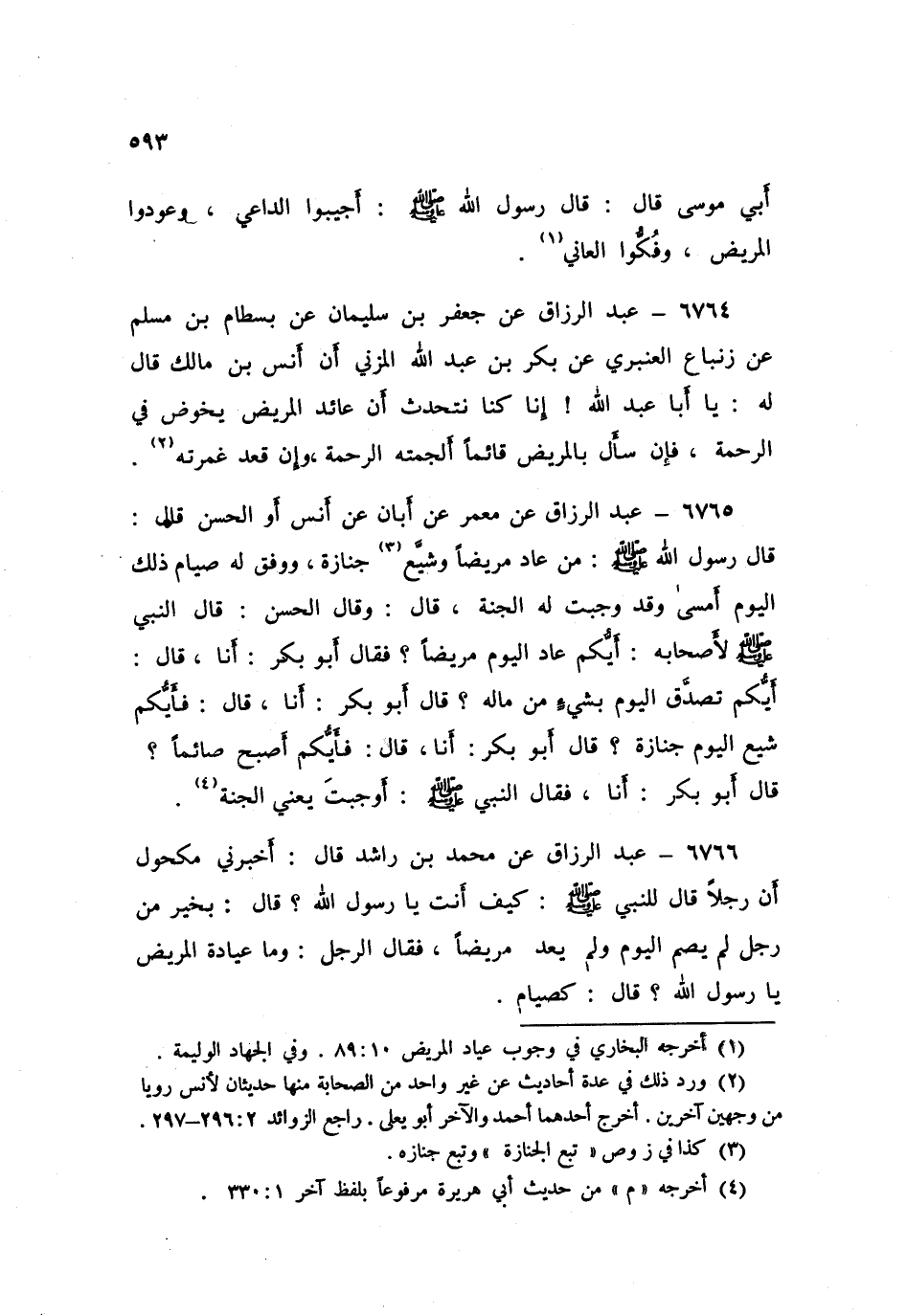 6766 - عَنْ مُحَمَّدِ بْنِ رَاشِدٍ قَالَ: أَخْبَرَنِي مَكْحُولٌ، أَنَّ رَجُلًا قَالَ لِلنَّبِيِّ صَلَّى اللهُ عَلَيْهِ وَسَلَّمَ: كَيْفَ أَنْتَ يَا رَسُولَ اللَّهِ؟ قَالَ: «§بِخَيْرٍ مِنْ رَجُلٍ لَمْ يَصُمُ الْيَوْمَ وَلَمْ يَعُدْ مَرِيضًا» فَقَالَ الرَّجُلُ: وَمَا عِيَادَةُ الْمَرِيضِ يَا رَسُولَ اللَّهِ؟ قَالَ: «كَصِيَامٍ»