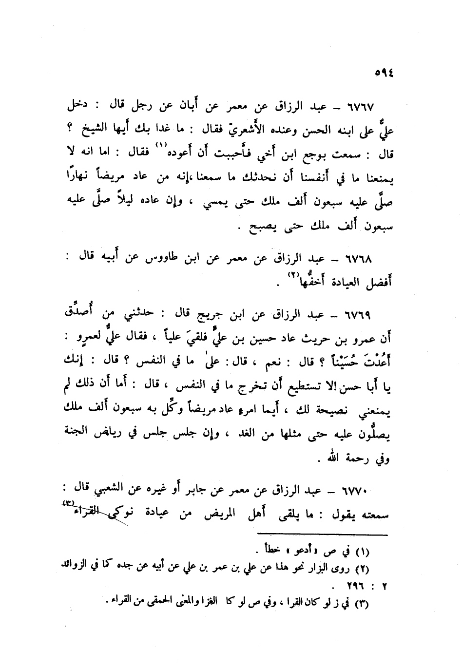 6770 - عَنْ مَعْمَرٍ، عَنْ جَابِرٍ، أَوْ غَيْرِهِ، عَنِ الشَّعْبِيِّ قَالَ: سَمِعْتُهُ يَقُولُ: «§مَا يَلْقَى أَهْلُ الْمَرِيضِ مِنِ عِيَادَةِ نَوْكَى الْقُرَّاءِ أَشَدُّ مِمَّا يَلْقَوْنَ مِنْ مَرِيضِهِمْ»