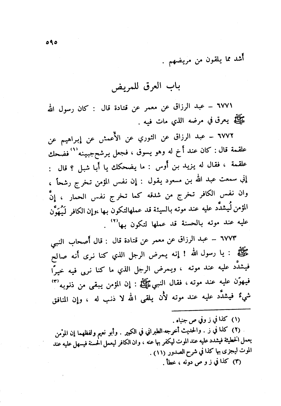 6771 - عَنْ مَعْمَرٍ، عَنْ قَتَادَةَ قَالَ: «كَانَ رَسُولُ اللَّهِ صَلَّى اللهُ عَلَيْهِ وَسَلَّمَ §يَعْرَقُ فِي مَرَضِهِ الَّذِي مَاتَ فِيهِ»