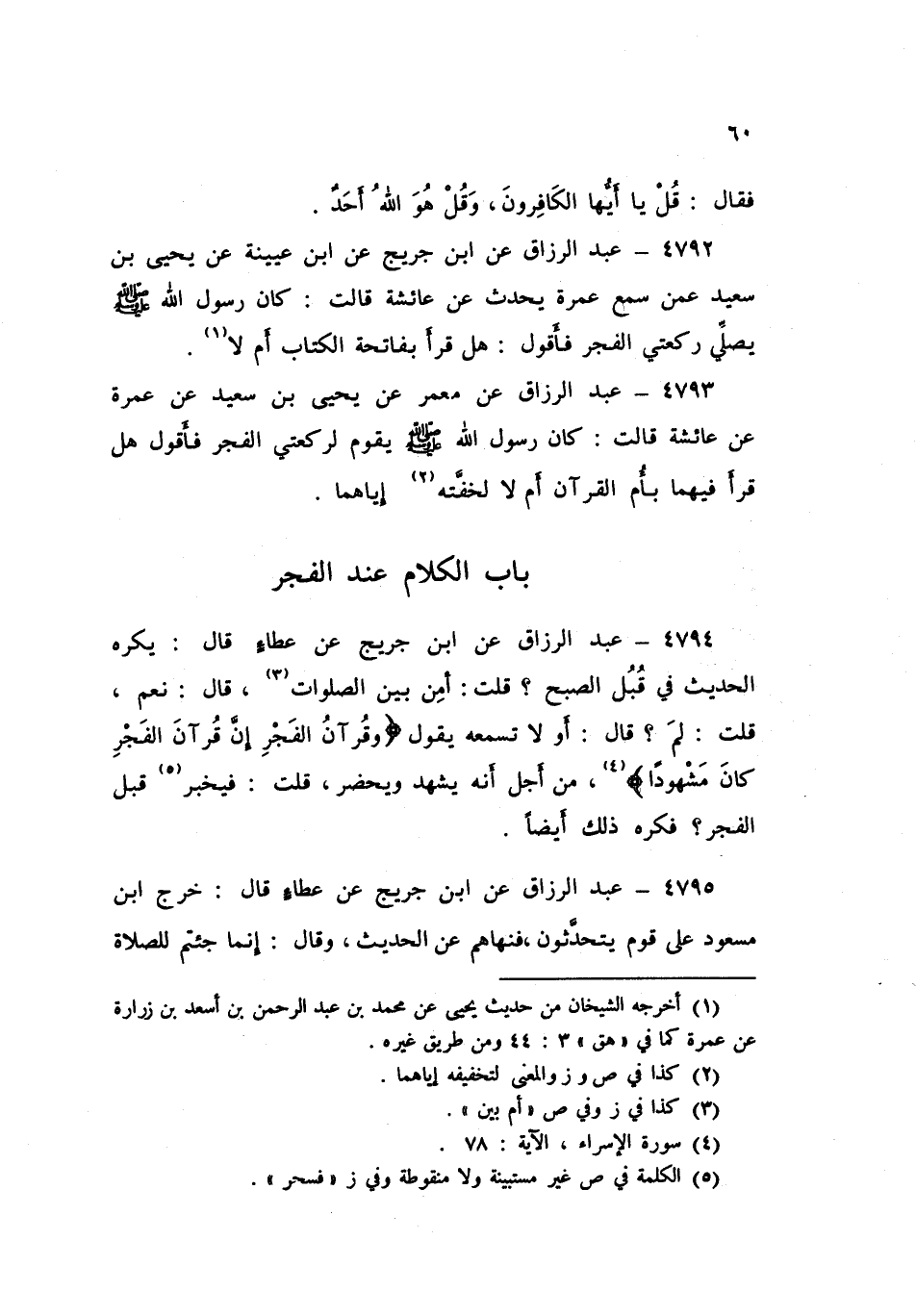 4794 - عَبْدُ الرَّزَّاقِ، عَنِ ابْنِ جُرَيْجٍ، عَنْ عَطَاءٍ قَالَ: «§يُكْرَهُ الْحَدِيثُ فِي قُبُلِ الصُّبْحِ»، قُلْتُ: أَمِنْ بَيْنِ الصَّلَوَاتِ؟ قَالَ: «نَعَمْ»، قُلْتُ: لِمَ؟ قَالَ: " أَوَ لَا تَسْمَعُهُ يَقُولُ: {وَقُرْآنَ الْفَجْرِ إِنَّ قُرْآنَ الْفَجْرِ كَانَ مَشْهُودًا} [الإسراء: 78] مِنْ أَجْلِ أَنَّهُ يُشْهَدُ وَيُحْضَرُ "، قُلْتُ: فِيُخْبِرُ قَبْلَ الْفَجْرِ؟ «فَكَرِهَ ذَلِكَ أَيْضًا»