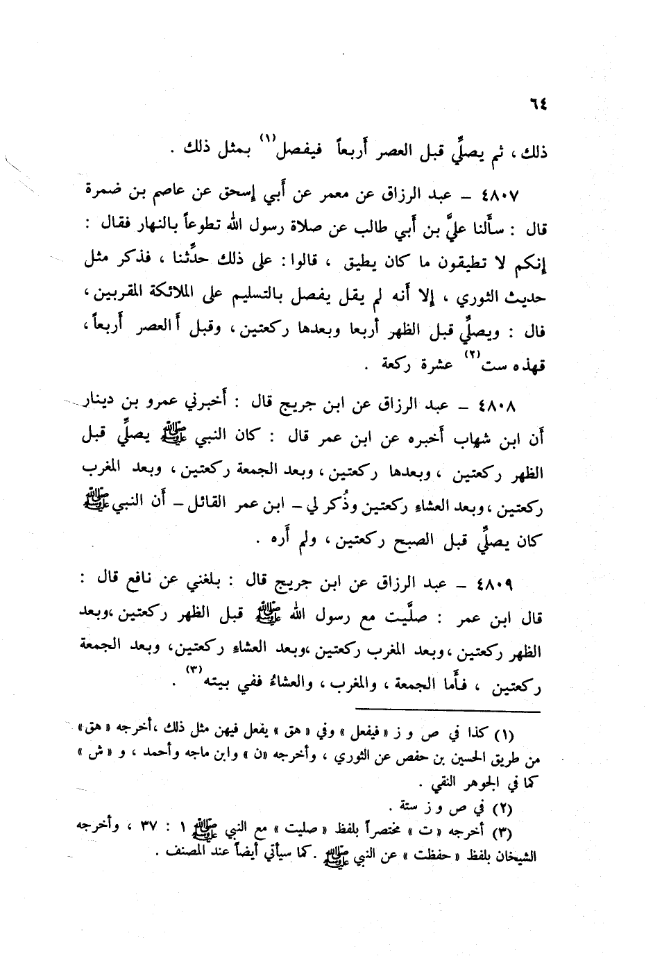 4807 - عَنْ مَعْمَرٍ، عَنْ أَبِي إِسْحَاقَ، عَنْ عَاصِمِ بْنِ ضَمْرَةَ قَالَ: سَأَلْنَا عَلِيَّ بْنَ أَبِي طَالِبٍ عَنْ صَلَاةِ رَسُولِ اللَّهِ تَطَوُّعًا بِالنَّهَارِ، فَقَالَ: «إِنَّكُمْ لَا تُطِيقُونَ مَا كَانَ يُطِيقُ» قَالُوا: عَلَى ذَلِكَ حَدِّثْنَا، فَذَكَرَ مِثْلَ حَدِيثِ الثَّوْرِيِّ إِلَّا أَنَّهُ لَمْ يقُلْ يَفْصِلُ بِالتَّسْلِيمِ عَلَى الْمَلَائِكَةِ الْمُقَرَّبِينَ قَالَ: «§وَيُصَلِّي قَبْلَ الظُّهُرِ أَرْبَعًا وَبَعْدَهَا رَكْعَتَيْنِ وَقَبْلَ الْعَصْرِ أَرْبَعًا فَهَذِهِ سِتَّ عَشْرَةَ رَكْعَةً»