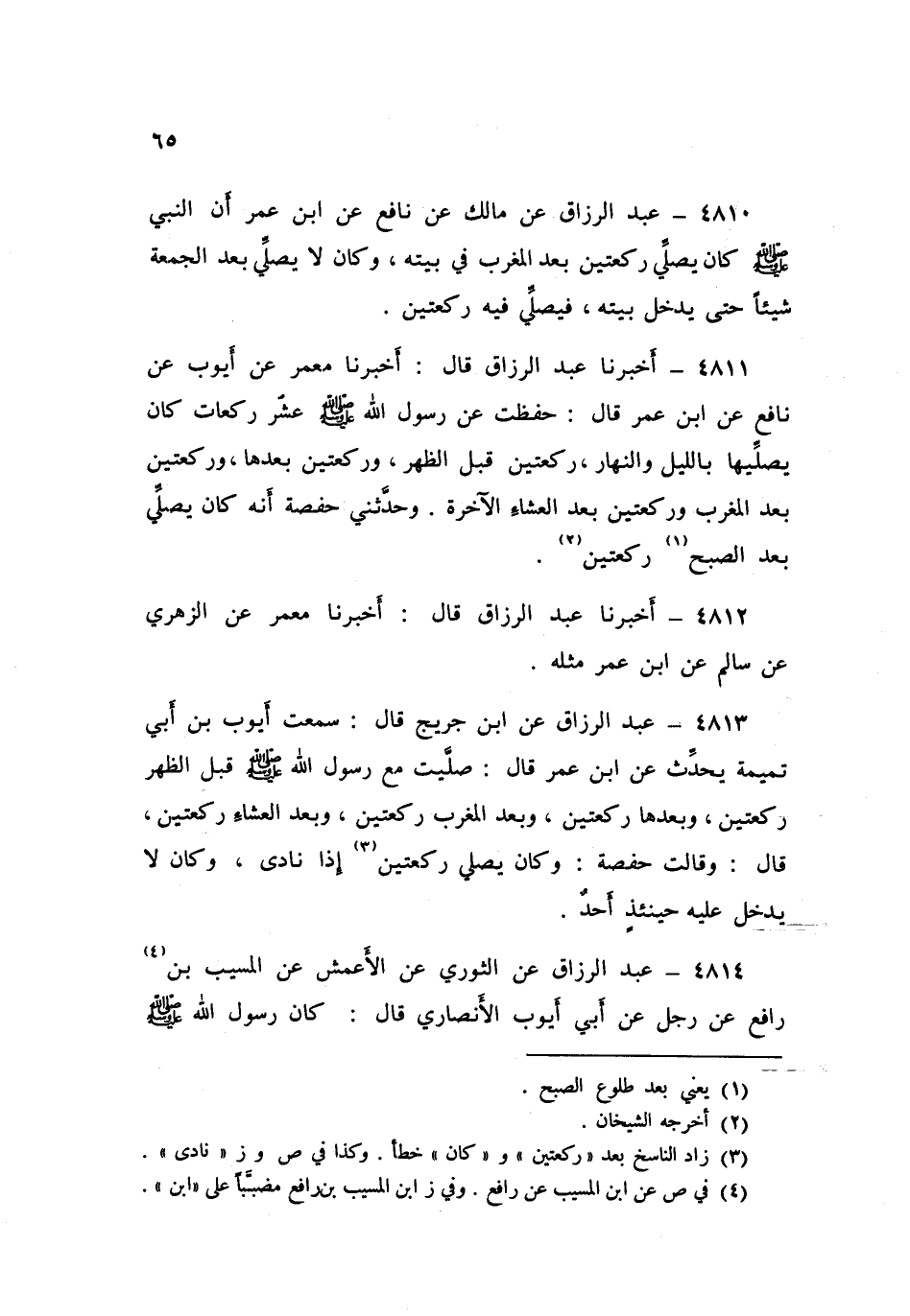 4811 - عَبْدُ الرَّزَّاقِ قَالَ: أَخْبَرَنَا مَعْمَرٌ، عَنْ أَيُّوبَ، عَنْ نَافِعٍ، عَنِ ابْنِ عُمَرَ قَالَ: " حَفِظْتُ عَنْ رَسُولِ اللَّهِ صَلَّى اللهُ عَلَيْهِ وَسَلَّمَ عَشْرَ رَكَعَاتٍ كَانَ §يُصَلِّيهَا بِاللَّيْلِ وَالنَّهَارِ: رَكْعَتَيْنِ قَبْلَ الظُّهْرِ، وَرَكْعَتَيْنِ بَعْدَهَا، وَرَكْعَتَيْنِ بَعْدَ الْمَغْرِبِ، وَرَكْعَتَيْنِ بَعْدَ الْعِشَاءِ الْآخِرَةِ، وَحَدَّثَتْنِي حَفْصَةُ أَنَّهُ كَانَ يُصَلِّي بَعْدَ الصُّبْحِ رَكْعَتَيْنِ أَخْبَرَنَا