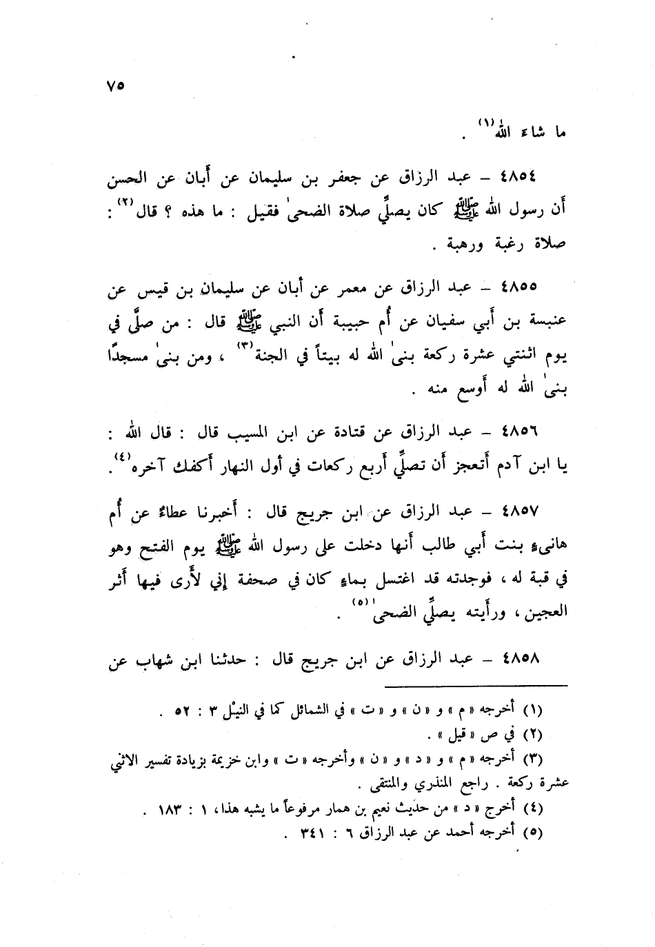 4859 - عَنْ مَعْمَرٍ، عَنِ الزُّهْرِيِّ، عَنْ أُمِّ هَانِئٍ أَنَّ النَّبِيَّ صَلَّى اللهُ عَلَيْهِ وَسَلَّمَ §صَلَّى ثَمَانِ رَكَعَاتٍ فِي الضُّحَى، قِيَامُهُنَّ وَرُكُوعُهُنَّ وَسُجُودُهُنَّ قَرِيبٌ مِنَ السَّوَاءِ "