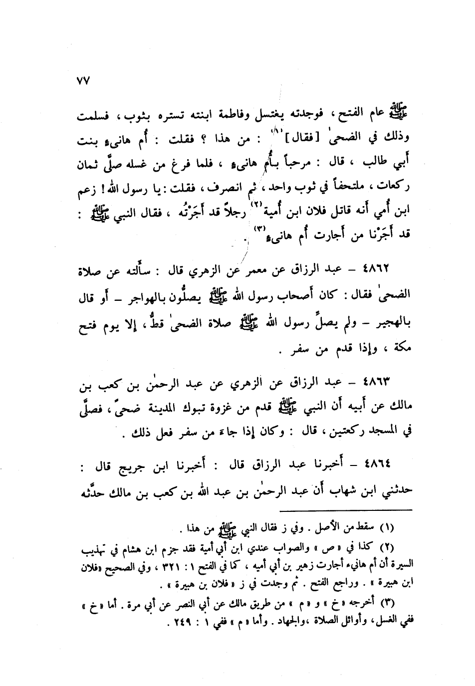 4864 - عَبْدُ الرَّزَّاقِ، أَخْبَرَنَا ابْنُ جُرَيْجٍ قَالَ: حَدَّثَنِي ابْنُ شِهَابٍ، أَنَّ عَبْدَ الرَّحْمَنِ بْنَ عَبْدِ اللَّهِ بْنِ كَعْبِ بْنِ مَالِكٍ، حَدَّثَهُ، عَنْ أَبِيهِ عَبْدِ اللَّهِ بْنِ كَعْبٍ، وَعَنْ عَمِّهِ عُبَيْدِ اللَّهِ بْنِ كَعْبٍ، عَنْ كَعْبِ بْنِ مَالِكٍ قَالَ: «كَانَ النَّبِيُّ صَلَّى اللهُ عَلَيْهِ وَسَلَّمَ لَا يَقْدَمُ مِنْ سَفَرٍ إِلَّا نَهَارًا فِي الضُّحَى §فَإِذَا قَدِمَ بَدَأَ بِالْمَسْجِدِ فَصَلَّى فِيهِ رَكْعَتَيْنِ ثُمَّ جَلَسَ فِيهِ»