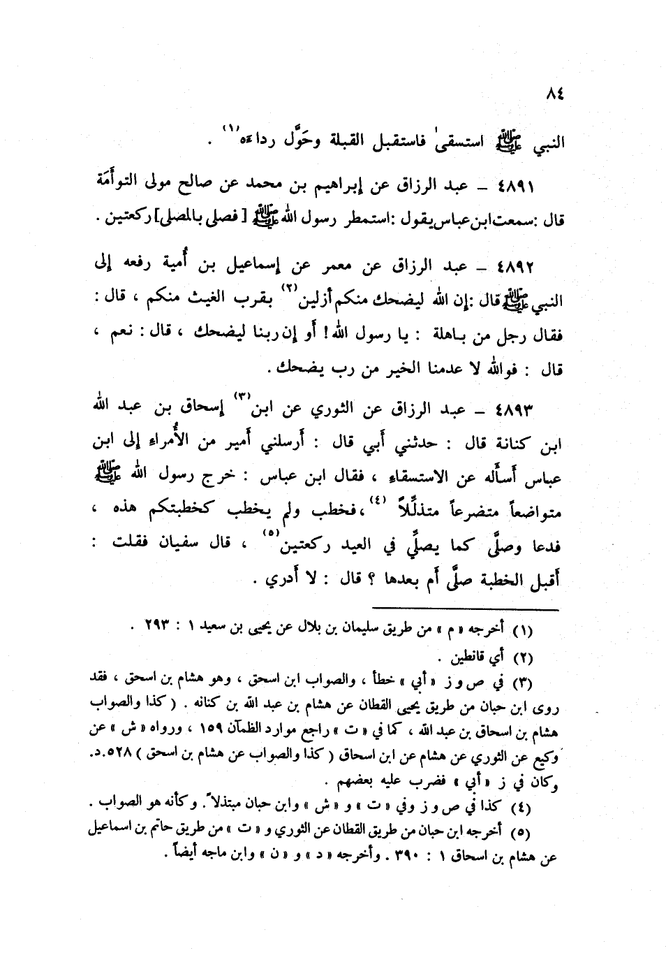 4893 - عَنِ الثَّوْرِيِّ، عَنِ ابْنِ إِسْحَاقَ بْنِ عَبْدِ اللَّهِ بْنِ كِنَانَةَ قَالَ: حَدَّثَنِي أَبِي قَالَ: أَرْسَلَنِي أَمِيرٌ مِنَ الْأُمَرَاءِ إِلَى ابْنِ عَبَّاسٍ أَسْأَلَهُ عَنِ الِاسْتِسْقَاءِ، فَقَالَ ابْنُ عَبَّاسٍ: «خَرَجَ رَسُولُ اللَّهِ صَلَّى اللهُ عَلَيْهِ وَسَلَّمَ مُتَوَاضِعًا مُتَضَرِّعًا مُتَذَلِّلًا فَخَطَبَ، وَلَمْ يَخْطُبْ كَخُطْبَتِكُمْ هَذِهِ، §فَدَعَا وَصَلَّى كَمَا يُصَلِّي فِي الْعِيدِ رَكْعَتَيْنِ»، قَالَ سُفْيَانُ: فَقُلْتُ: أَقَبْلَ الْخُطْبَةِ صَلَّى أَمْ بَعْدَهَا؟ قَالَ: «لَا أَدْرِي»