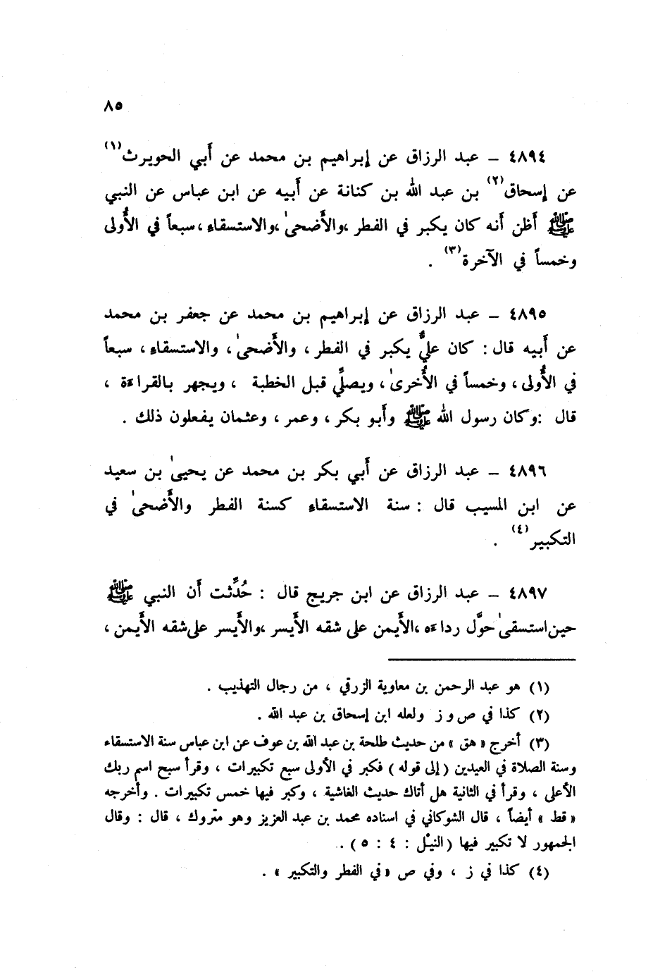 4895 - عَنْ إِبْرَاهِيمَ بْنِ مُحَمَّدٍ، عَنْ جَعْفَرِ بْنِ مُحَمَّدٍ، عَنْ أَبِيهِ قَالَ: " كَانَ عَلِيٌّ §يُكَبِّرُ فِي الْفِطْرِ وَالْأَضْحَى وَالِاسْتِسْقَاءِ سَبْعًا فِي الْأُولَى، وَخَمْسًا فِي الْأُخْرَى، وَيُصَلِّي قَبْلَ الْخُطْبَةِ، وَيَجْهَرُ بِالْقِرَاءَةِ قَالَ: وَكَانَ رَسُولُ اللَّهِ صَلَّى اللهُ عَلَيْهِ وَسَلَّمَ وَأَبُو بَكْرٍ وَعُمَرَ وَعُثْمَانَ يَفْعَلُونَ ذَلِكَ