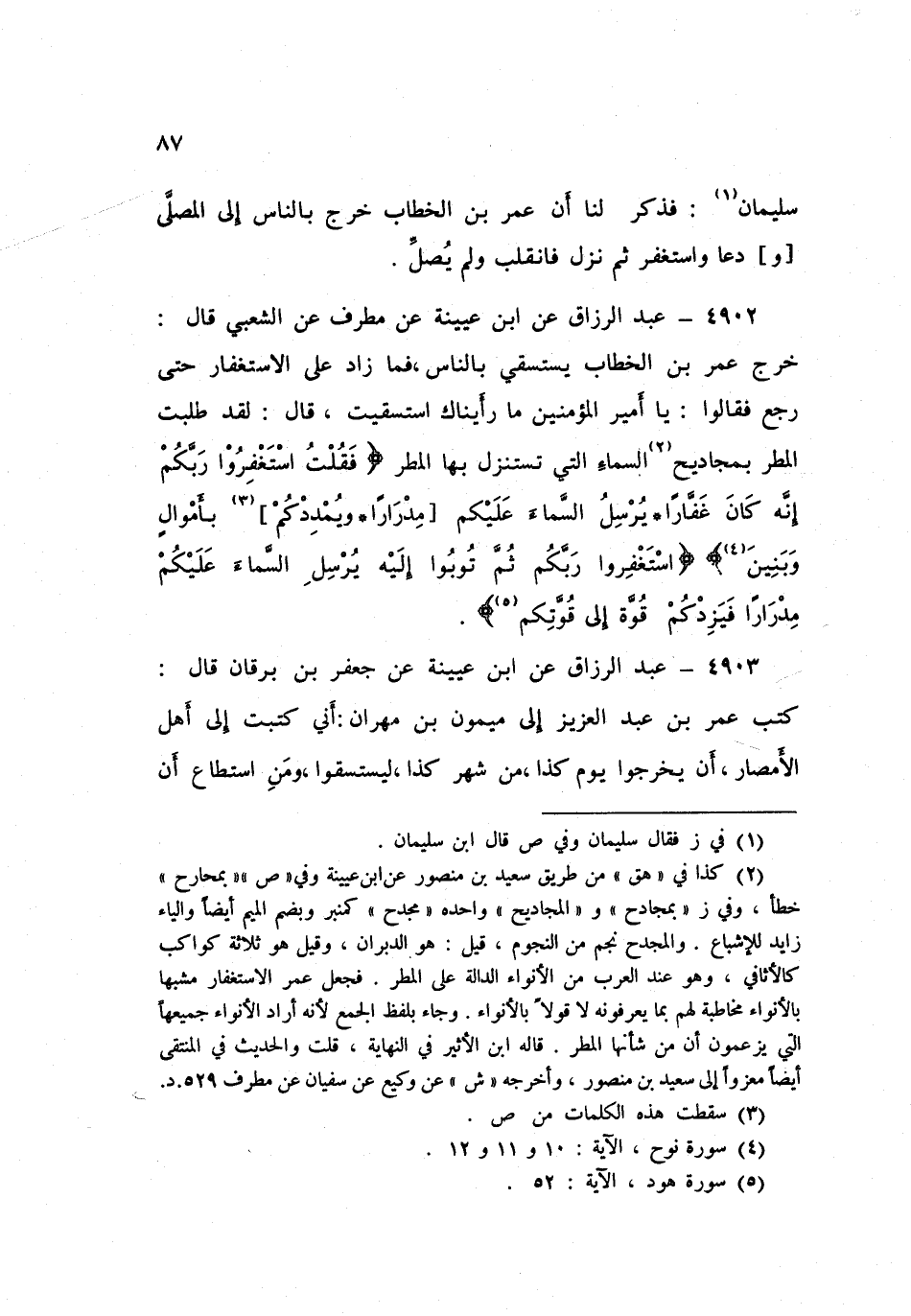 4903 - عَنِ ابْنِ عُيَيْنَةَ، عَنْ جَعْفَرِ بْنِ بُرْقَانَ قَالَ: كَتَبَ عُمَرُ بْنُ عَبْدِ الْعَزِيزِ إِلَى مَيْمُونِ بْنِ مِهْرَانَ: " إِنِّي §كَتَبْتُ إِلَى أَهْلِ الْأمْصَارِ أَنْ يَخْرُجُوا يَوْمَ كَذَا مِنْ شَهْرِ كَذَا لِيَسْتَسْقُوا، وَمَنِ اسْتَطَاعَ أَنْ -[88]- يَصُومَ وَيَتَصَدَّقَ فَلْيَفْعَلْ، فَإِنَّ اللَّهَ يَقُولُ: {قَدْ أَفْلَحَ مَنْ تَزَكَّى وَذَكَرَ اسْمَ رَبِّهِ فَصَلَّى} [الأعلى: 15] وَقُولُوا كَمَا قَالَ أَبَوَاكُمْ {رَبَّنَا ظَلَمْنَا أَنْفُسَنَا وَإِنْ لَمْ تَغْفِرْ لَنَا وَتَرْحَمْنَا لَنَكُونَنَّ مِنَ الْخَاسِرِينَ} [الأعراف: 23] وَقُولُوا كَمَا قَالَ نُوحٌ: {إِلَّا تَغْفِرْ لِي وَتَرْحَمْنِي أَكُنْ مِنَ الْخَاسِرِينَ} [هود: 47] وَقُولُوا كَمَا قَالَ مُوسَى: {إِنِّي ظَلَمْتُ نَفْسِي فَاغْفِرْ لِي فِغَفَرَ لَهُ إِنَّهُ هُوَ الْغَفُورُ الرَّحِيمُ} [القصص: 16] وَقُولُوا كَمَا قَالَ يُونُسُ عَلَيْهِ السَّلَامُ: {لَا إِلَهَ إِلَّا أَنْتَ سُبْحَانَكَ إِنِّي كُنْتُ مِنَ الظَّالِمِينَ} [الأنبياء: 87] "