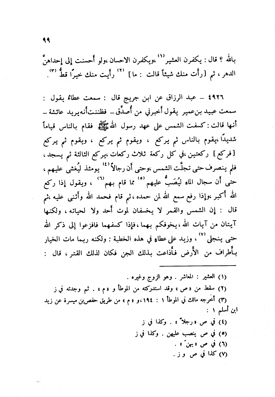4926 - عَنِ ابْنِ جُرَيْجٍ قَالَ: سَمِعْتُ عَطَاءً يَقُولُ: سَمِعْتُ عُبَيْدَ بْنَ عُمَيْرٍ يَقُولُ: أَخْبَرَنِي مَنْ أُصَدِّقُ، ـ فَظَنَنْتُ أَنَّهُ يُرِيدُ عَائِشَةَ ـ أَنَّهَا قَالَتْ: كَسَفَتِ الشَّمْسُ عَلَى عَهْدِ رَسُولِ اللَّهِ صَلَّى اللهُ عَلَيْهِ وَسَلَّمَ فَقَامَ بِالنَّاسِ قِيَامًا شَدِيدًا، يَقُومُ بِالنَّاسِ ثُمَّ يَرْكَعُ، وَيَقُومُ ثُمَّ يَرْكَعُ، وَيَقُومُ ثُمَّ يَرْكَعُ، فَرَكَعَ رَكْعَتَيْنِ فِي كُلِّ رَكْعَةٍ ثَلَاثُ رَكَعَاتٍ، يَرْكَعُ الثَّالِثَةَ ثُمَّ يَسْجُدُ، فَلَمْ يَنْصَرِفْ حَتَّى تَجَلَّتِ الشَّمْسُ، وَحَتَّى أَنَّ رِجَالًا يَوْمَئِذٍ لَيُغْشَى عَلَيْهِمْ، حَتَّى أَنَّ سِجَالَ الْمَاءِ لَيُصَبُّ عَلَيْهِمْ مِمَّا قَامَ بِهِمْ، وَيَقُولُ إِذَا رَكَعَ: اللَّهُ أَكْبَرُ، وَإِذَا رَفَعَ سَمِعَ اللَّهُ لِمَنْ حَمِدَهُ، ثُمَّ قَامَ فَحَمِدَ اللَّهَ وَأَثْنَى عَلَيْهِ، ثُمَّ قَالَ: «إِنَّ §الشَّمْسَ وَالْقَمَرَ لَا يَخْسِفَانِ لِمَوْتِ أَحَدٍ وَلَا لِحَيَاتِهِ وَلَكِنَّهَا آيَتَانِ مِنْ آيَاتِ اللَّهِ يُخَوِّفُكُمْ بِهِمَا، فَإِذَا كَسَفَهُمَا فَافْزَعُوا إِلَى ذِكْرِ اللَّهِ حَتَّى ينْجَلِيَ» وَزِيدَ عَلَى عَطَاءٍ فِي هَذِهِ الْخُطْبَةِ: وَلَكِنَّهُ رُبَّمَا مَاتَ الْخِيَارُ بِأَطْرَافٍ مِنَ الْأَرْضِ فَأَذَاعَتْ بِذَلِكَ الْجِنُّ فَكَانَ لِذَلِكَ الْقَتَرُ قَالَ -[100]-: فَأَخْبَرَنِي غَيْرُ عُبَيْدٍ: يَقُولُ: قَالَ: عُرِضَتِ الْجَنَّةُ وَالنَّارُ عَلَى النَّبِيِّ صَلَّى اللهُ عَلَيْهِ وَسَلَّمَ وَهُوَ فِي صَلَاتِهِ يَوْمَ كَسَفَتِ الشَّمْسُ فَتَأَخَّرَ عَنْ مُصَلَّاهُ وَرَاءَهُ حَتَّى أَنَّ النَّاسَ لَيَرْكَبُ بَعْضُهُمْ عَلَى بَعْضٍ، وَيَقُولُ: أَيْ رَبِّ وَأَنَا، أَيْ رَبِّ وَأَنَا، ثُمَّ عَادَ يَسِيرُ حَتَّى رَجَعَ فِي مُصَلَّاهُ فَرَأَى إِذْ عُرِضَتْ عَلَيْهِ النَّارُ أَبَا خُزَاعَةَ عَمْرَو بْنَ لُحَيٍّ فِي النَّارِ يَجُرُّ قَصَبَهُ قَالَ: وَكَانُوا زَعَمُوا يَسْرِقُ الْحَاجَّ بِمِحْجَنٍ لَهُ، وَيَقُولُ: أَيْ رَبِّ لَا أَسْرِقُ إِنَّمَا يَسْرِقُ مِحْجَنِي قَالَ: وَصَاحِبَةُ الْهِرَّةِ امْرَأَةٌ رَبَطَتْهَا فَلَمْ تُطْعِمْهَا وَلَمْ تُرْسِلْهَا وَلَمْ تَسْقِهَا فَتَأْكُلُ وَتَشَرَبُ حَتَّى مَاتَتْ هُزَالًا، وَإِذَا رَجَعَ عُرِضَتْ عَلَيْهِ الْجَنَّةُ فَذَهَبَ يَمْشِي حَتَّى رَجَعَ فِي مُصَلَّاهُ، ثُمَّ قَالَ: أَرَدْتُ أَنْ آخُذَ مِنْهَا قَطْفًا لِأُرِيكُمُوهُ فَلَمْ يَقْدِرْ. قَالَ ابْنُ جُرَيْجٍ، وَقَالَ الْحَسَنُ: فَزِعَ النَّبِيُّ صَلَّى اللهُ عَلَيْهِ وَسَلَّمَ يَوْمَئِذٍ حَتَّى أَنَّهُ يَجُرُّ رِدَاءَهُ قَالَ عَبْدُ الرَّزَّاقِ: أَذَاعَتْ يَعْنِي أَخْبَرَتِ الْجِنُّ بَعْضُهَا بَعْضًا، وَيَعْنِي الْقَتَرَةَ: الْحُمْرَةُ الَّتِي تَكُونُ فِي الْقَمَرِ، وَالذي يَجُرُّ قَصَبَهُ يَعْنِي: حَشَاهُ
