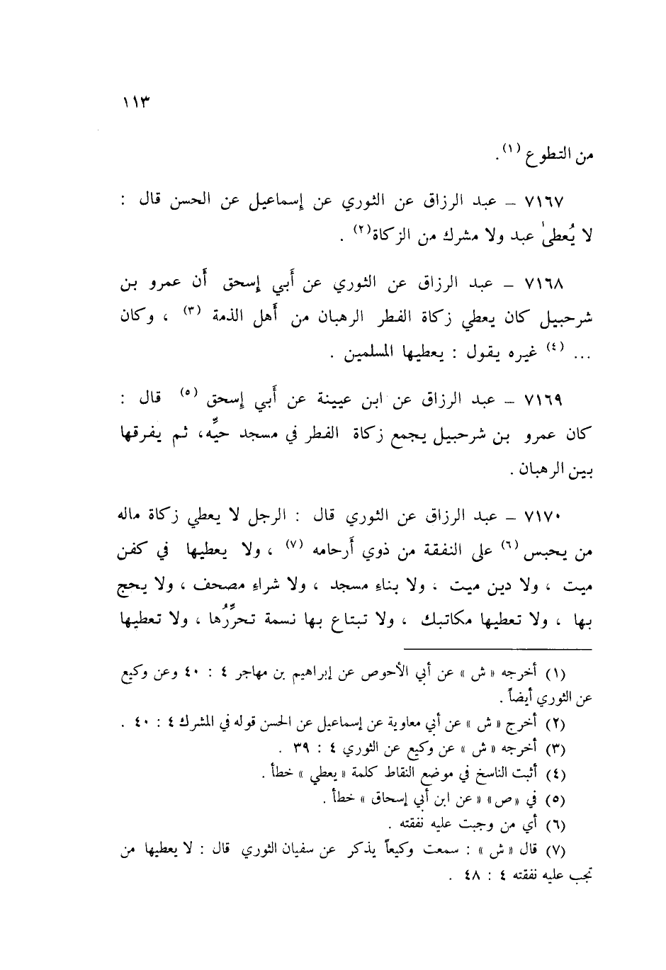 7168 - عَنِ الثَّوْرِيِّ، عَنْ أَبِي إِسْحَاقَ، أَنَّ عَمْرَو بْنَ شُرَحْبِيلَ: " كَانَ §يُعْطِي زَكَاةَ الْفِطْرِ الرُّهْبَانَ مِنْ أَهْلِ الذِّمَّةِ، وَكَانَ غَيْرُهُ يَقُولُ: يُعْطِيهَا الْمُسْلِمِينَ "