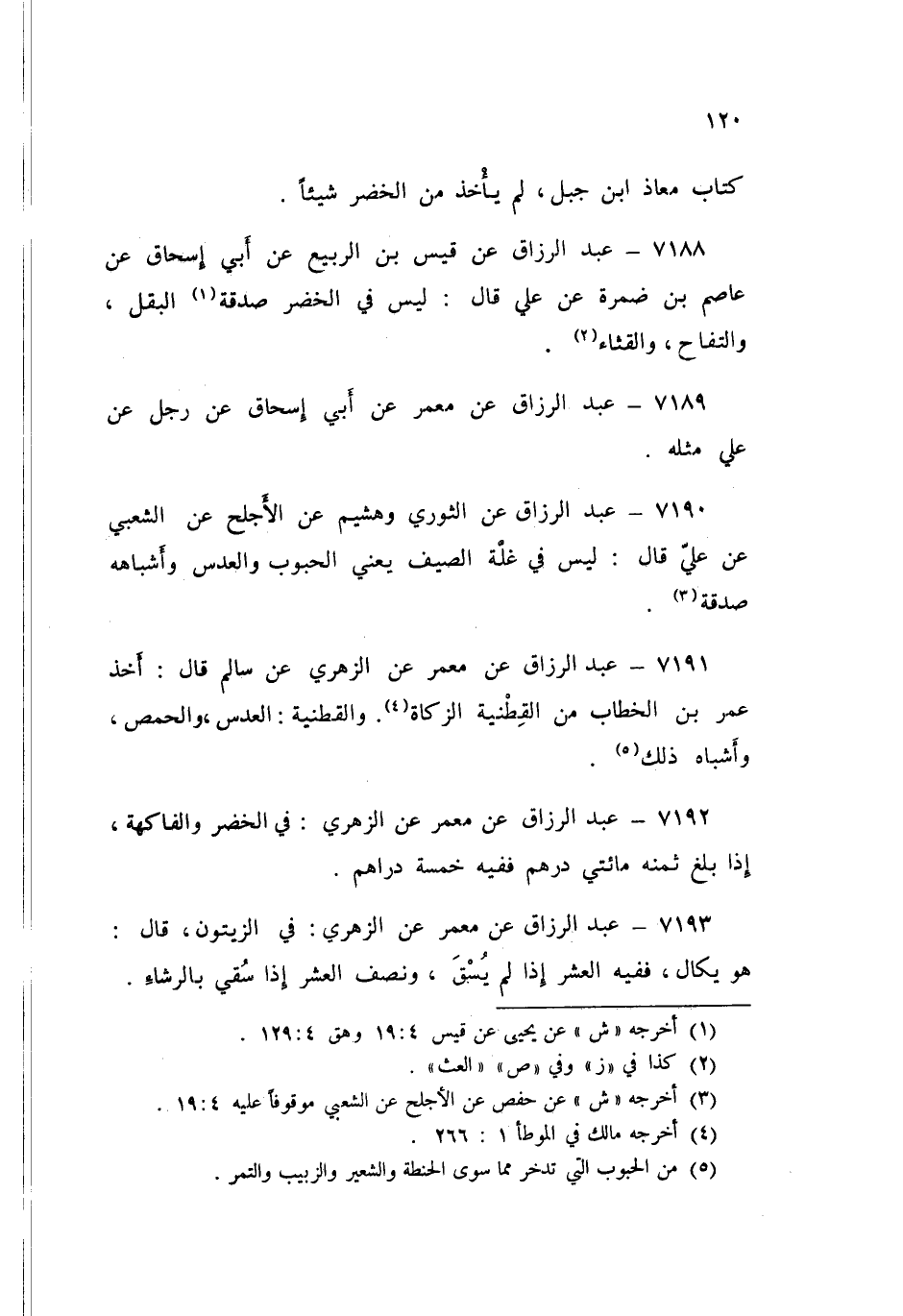 7193 - عَنْ مَعْمَرٍ، عَنِ الزُّهْرِيِّ فِي §الزَّيْتُونِ قَالَ: «هُوَ يُكَالُ، فَفَيهِ الْعُشْرُ إِذَا لَمْ يُسْقَ، وَنِصْفُ الْعُشْرِ إِذَا سُقِيَ بِالرِّشَاءِ»