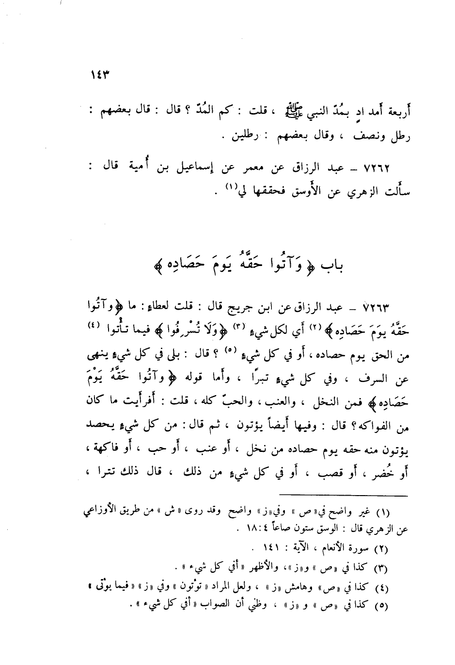 7263 - عَنِ ابْنِ جُرَيْجٍ قَالَ: قُلْتُ لِعَطَاءٍ: مَا {وَآتُوا حَقَّهُ يَوْمَ حَصَادِهِ} [الأنعام: 141] أَيْ: لِكُلِّ شَيْءٍ، {وَلَا تُسْرِفُوا} [الأنعام: 141] فِيمَا تَأْتُوا مِنَ الْحَقِّ يَوْمَ حَصَادِهِ، أَوْفِي كُلِّ شَيْءٍ؟ قَالَ: " بَلَى فِي كُلُّ شَيْءٍ يَنْهَى عَنِ السَّرَفِ، وَفِي كُلِّ شَيْءٍ تَتْرَى، وَأَمَّا قَوْلُهُ: {§وَآتُوا حَقَّهُ يَوْمُ حَصَادِهِ} [الأنعام: 141] فَمِنَ النَّخْلِ، وَالْعِنَبْ، وَالْحَبِّ كُلِّهِ "، قُلْتُ: أَفَرَأَيْتَ مَا كَانَ مِنَ الْفَوَاكِهِ؟ قَالَ: «وَفَيهَا أَيْضًا يُؤْتُونَ»، ثُمَّ قَالَ: «مِنْ كُلِّ شَيْءٍ يُحْصَدُ يُؤْتُونَ مِنْهُ حَقَّهُ يَوْمَ حَصَادِهِ مِنْ نَخْلٍ، أَوْ عِنَبٍ، أَوْ حَبٍّ، أَوْ فَاكِهَةٍ، أَوْ خُضَرٍ، أَوْ قَصَبٍ، أَوْ فِي كُلِّ شَيْءٍ مِنْ ذَلِكَ» قَالَ: «ذَلِكَ تَتْرَى» -[144]-، قُلْتُ: أَوَاجِبٌ ذَلِكَ عَلَى النَّاسِ؟ قَالَ: " نَعَمْ، ثُمَّ تَلَا {وَآتُوا حَقَّهُ يَوْمَ حَصَادِهِ} [الأنعام: 141] "، ثُمَّ قُلْتُ: هَلْ مِنْ شَيْءٍ مَوْصُوفٍ مَعْلُومٍ؟ قَالَ: «لَا»، قُلْتُ: فَإِذَا تَصَدَّقْتَ مِمَّا أَدْفَعُ بِقَلِيلِ الصَّدَقَةِ أَوْ بِكَثِيرهَا، أَيُجْزِئُ عَنِّي؟ قَالَ: «نَعَمْ حَسْبُكَ»، قُلْتُ: فَإِنْ لَمْ يَحْضُرْنِي مَسَاكِينُ خَبَّأْتُ لَهُمْ؟ قَالَ: «نَعَمْ، أَوْ تُرْسِلُ إِلَى جِيرَانِكَ» قَالَ: فَيُجْزِئُ عَنِّي إِذَا أَعْطَيْتُ جَارِي؟ قَالَ: «نَعَمْ، إِذَا كَانَ ذَا حَاجَةٍ» قَالَ: قُلْتُ: كَانَ لِي حَبٌّ شَتَّى مِنْ دَخَنٍ، وَسُلْتٍ، وَتَمْرٍ، وَشَعِيرٍ، وَمِنْ حَبٍّ شَتَّى فَحَصَيتُ ذَلِكَ جَمِيعًا ثَمَرَةً، أُطْعِمُ مِنْ كُلِّ بَابٍ مِنَ الْحَبِّ أَمْ حَسْبِي أَنْ أُطْعِمَ مِنْ كُلِّ وَاحِدٍ قَالَ: «بَلْ أُطْعِمُ مِنْ كُلِّ بَابٍ مِنَ الْحَبِّ» قَالَ: «ذَلِكَ تَتْرَا»، قُلتُ لَهُ: مَا الدَّخَنُ؟ قَالَ: «حَبٌّ يَكُونُ بِالطَّائِفِ، وَالسُّلْتُ مِثْلُ الشَّعِيرِ لَيْسَ لَهُ قِشْرٌ، وَهَوَ السَّاقَةُ»