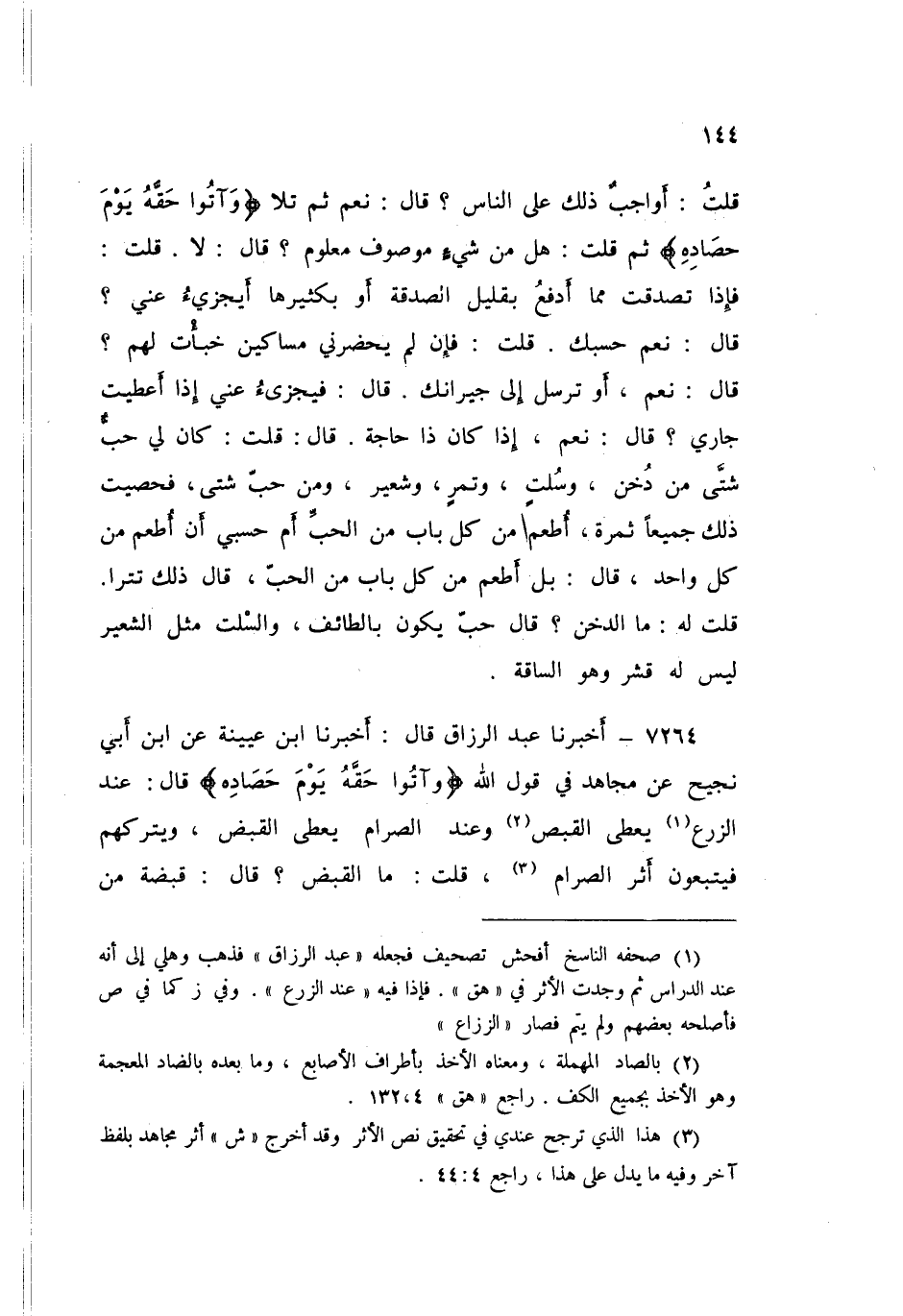 7264 - عَبْدُ الرَّزَّاقِ قَالَ: أَخْبَرَنَا ابْنُ عُيَيْنَةَ، عَنِ ابْنِ أَبِي نَجِيحٍ، عَنْ مُجَاهِدٍ فِي قَوْلِ اللَّهِ: {§وَآتُوا حَقَّهُ يَوْمَ حَصَادِهِ} [الأنعام: 141] قَالَ: «عِنْدَ الزَّرْعِ يُعْطِي الْقَبْصَ، وَعِنْدَ الصِّرَامِ يُعْطَى الْقَبْضَ، وَيَتْرُكُهُمْ فَيَتَّبِعُونَ أَثَرَ الصَّرَامِ» قُلْتُ: مَا الْقَبْضُ؟ قَالَ: «قَبْضَةٌ مِنْ سُنْبُلٍ»، قُلْنَا: مَا الْقَبْصُ؟ قَالَ: «إِذَا زَرَعْتُ تُعْطِيهِمْ مِنَ الصَّبِيبِ بِأَطْرَافِ أَصَابِعِكَ، وَأَشَارَ بِهَا»