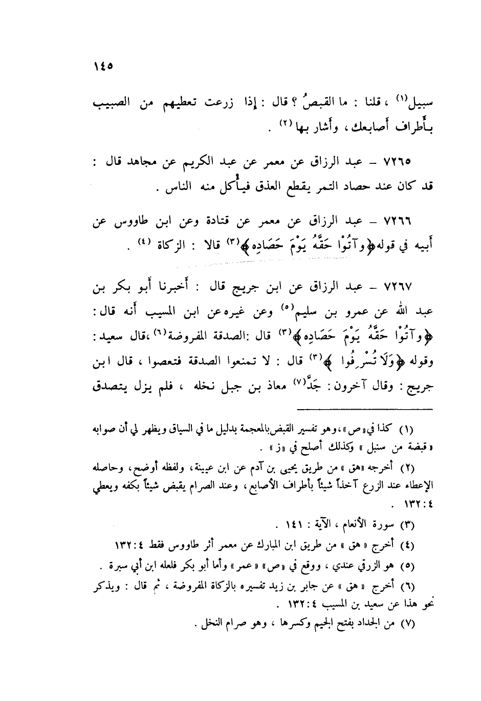 7267 - عَنِ ابْنِ جُرَيْجٍ قَالَ: أَخْبَرَنَا أَبُو بَكْرِ بْنُ عَبْدِ اللَّهِ، عَنْ عَمْرِو بْنِ سُلَيْمٍ، وَعَنْ غَيْرِهِ، عَنِ ابْنِ الْمُسَيِّبِ، أَنَّهُ قَالَ: {§وَآتُوا حَقَّهُ يَوْمَ حَصَادِهِ} [الأنعام: 141] قَالَ: «الصَّدَقَةُ الْمَفْرُوضَةٌ»، قَالَ سَعِيدٌ: وَقَوْلُهُ: {وَلَا تُسْرِفُوا} [الأنعام: 141] قَالَ: «لَا تَمْنَعُوا الصَّدَقَةَ فَتَعْصُوا» قَالَ ابِنُ جُرَيْجٍ: وَقَالَ آخَرُونَ: «جَدَّ مُعَاذُ بْنُ جَبَلٍ نَخْلَهُ فَلَمْ يَزَلْ يَتَصَدَّقُ مِنْ تَمْرَهُ حَتَّى لَمْ يَبْقَ مِنْهَا شَيْءٌ»، فَنَزَلَتْ: {وَلَا تُسْرِفُوا} [الأنعام: 141]