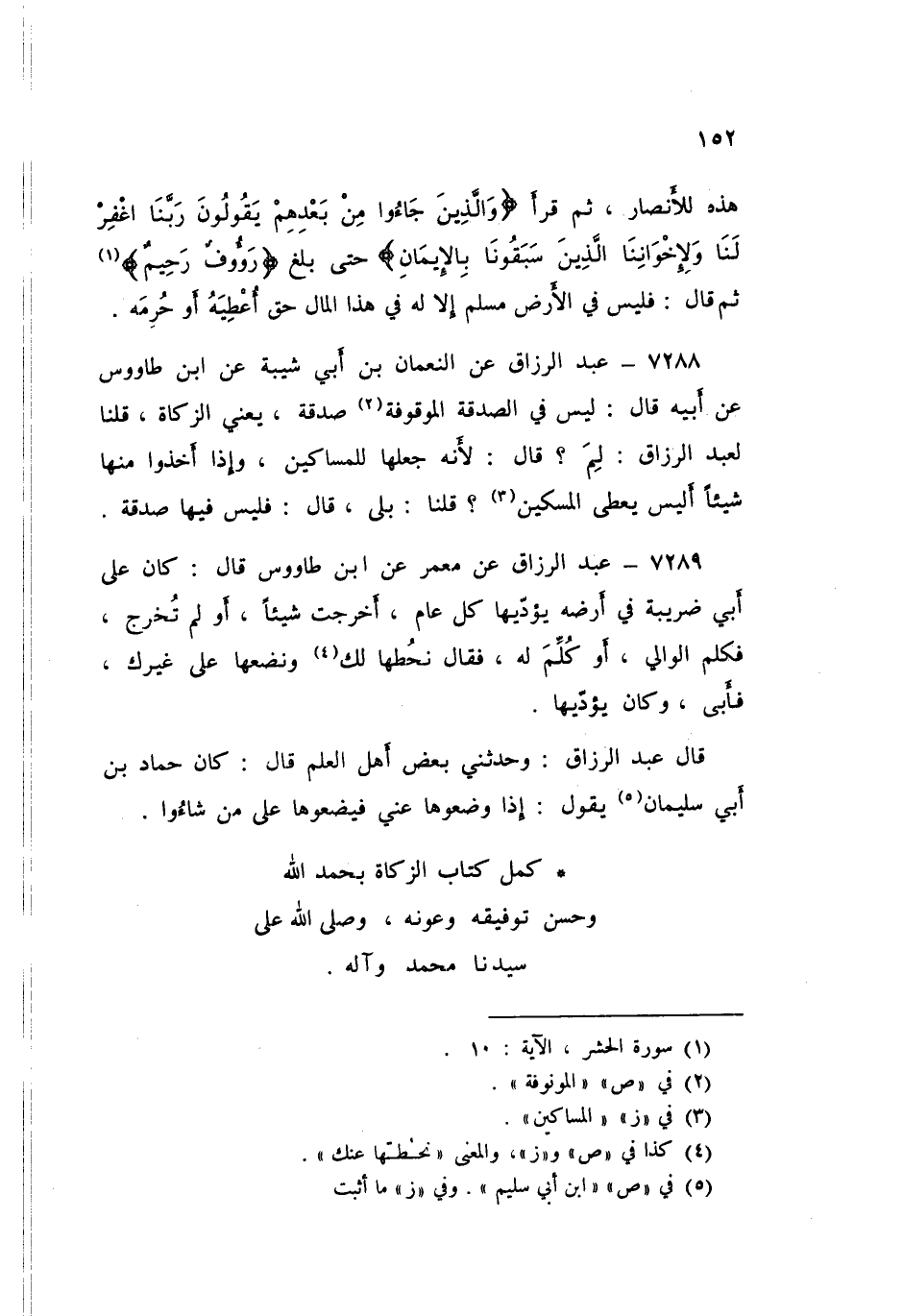 7288 - عَنِ النُّعْمَانِ بْنِ أَبِي شَيْبَةَ، عَنِ ابْنِ طَاوُسٍ، عَنْ أَبِيهِ قَالَ: «§لَيْسَ فِي الصَّدَقَةِ الْمَوْقُوفَةِ صَدَقَةٌ، يَعْنِي الزَّكَاةَ» قُلْنَا لِعَبْدِ الرَّزَّاقِ: لِمَ؟ قَالَ: " لِأَنَّهُ جَعَلَهَا لِلْمَسَاكِينِ، وَإِذَا أَخَذُوا مِنْهَا شَيْئًا، أَلَيْسَ يُعْطَى الْمِسْكِينُ؟ قُلْنَا: بَلَى قَالَ: فَلَيْسَ فِيهَا صَدَقَةٌ "