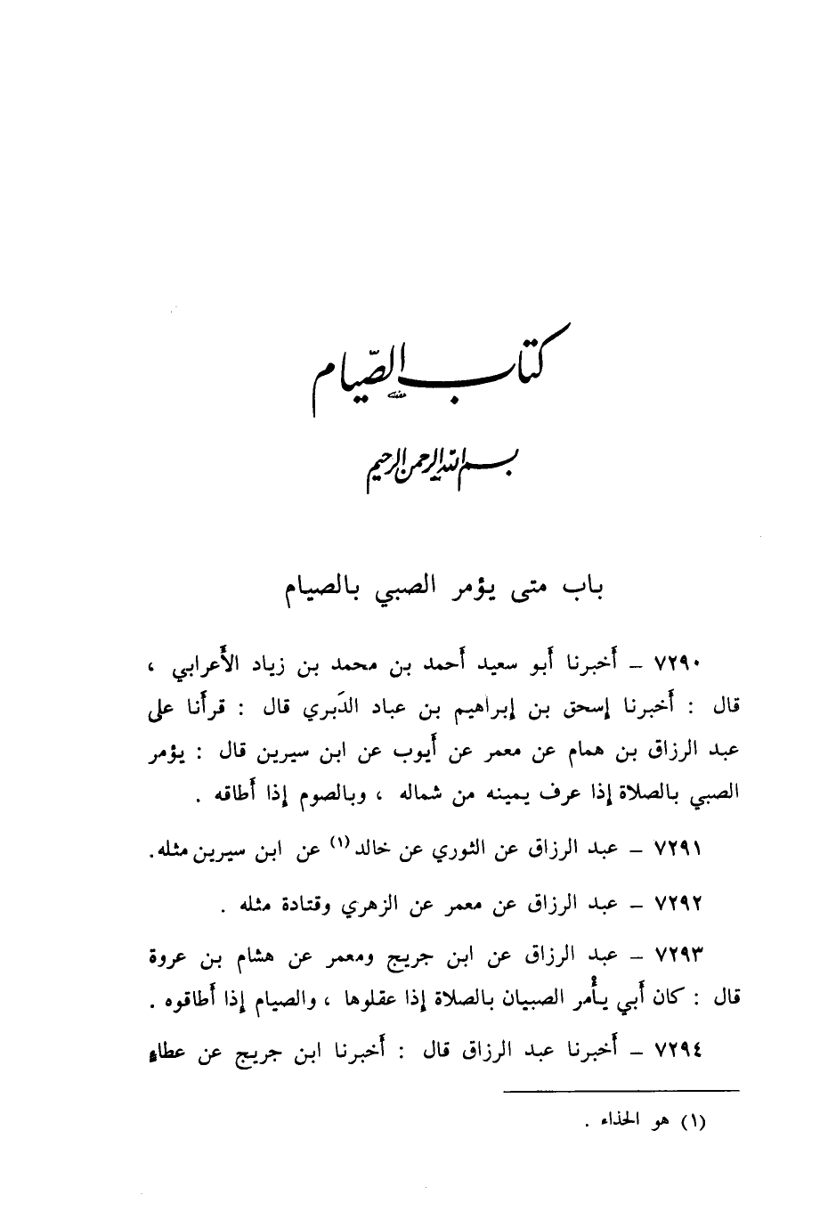 7293 - عَنِ ابْنِ جُرَيْجٍ، وَمَعْمَرٌ، عَنْ هِشَامِ بْنِ عُرْوَةَ قَالَ: «كَانَ أَبِي §يَأْمُرُ الصِّبْيَانَ بِالصَّلَاةِ إِذَا عَقَلُوهَا، وَالصِّيَامِ إِذَا أَطَاقُوهُ»