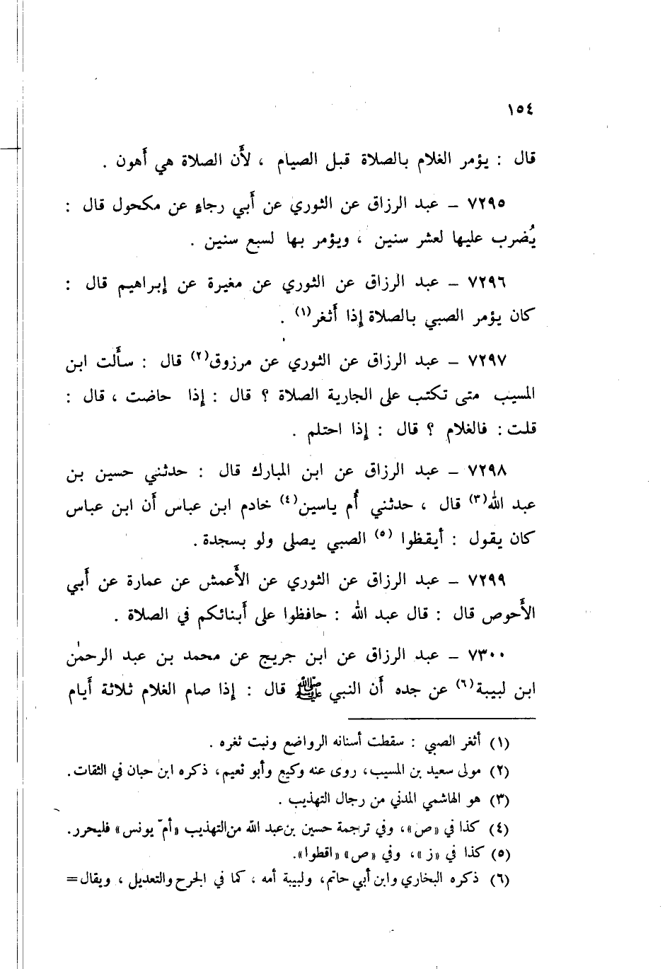 7296 - عَنِ الثَّوْرِيِّ، عَنْ مُغِيرَةَ، عَنْ إِبْرَاهِيمَ قَالَ: «كَانَ §يُؤْمَرُ الصَّبِيُّ بِالصَّلَاةِ إِذَا أَثْغَرَ»
