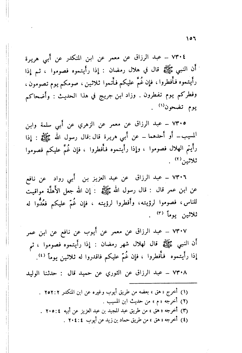 7307 - عَنْ مَعْمَرٍ، عَنْ أَيُّوبَ، عَنْ نَافِعٍ، عَنِ ابْنِ عُمَرَ، أَنَّ النَّبِيَّ صَلَّى اللهُ عَلَيْهِ وَسَلَّمَ قَالَ لِهِلَالِ شَهْرِ رَمَضَانَ: «§إِذَا رَأَيْتُمُوهُ فَصُومُوا ثُمَّ إِذَا رَأَيْتُمُوهُ، فَأَفْطِرُوا فَإِنْ غُمَّ عَلَيْكُمْ فَاقْدُرُوَا لَهُ ثَلَاثِينَ يَوْمًا»