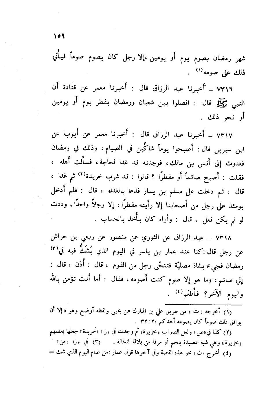 7317 - عَبْدُ الرَّزَّاقِ قَالَ: أَخْبَرَنَا مَعْمَرٌ، عَنْ أَيُّوبَ، عَنِ ابْنِ سِيرِينَ قَالَ: " أَصْبَحُوَا يَوْمًا شَاكِّينَ فِي الصِّيَامِ، وَذَلِكَ فِي رَمَضَانَ فَغَدَوْتُ إِلَى أَنَسِ بْنِ مَالِكٍ فَوَجَدْتُهُ قَدْ غَدَا لِحَاجَةٍ، فَسَأَلْتُ أَهْلَهُ، فَقُلْتُ: أَصْبَحَ صَائِمًا أَوْ مُفْطِرًا؟ قَالُوا: قَدْ شَرِبَ خَرِيدَةً، ثُمَّ غَدَا قَالَ: ثُمَّ دَخَلْتُ عَلَى مُسْلِمِ بْنِ يَسَارٍ، فَدَعَا بِالْغَدَاءِ قَالَ: §فَلَمْ أَدْخُلْ يَوْمَئِذٍ عَلَى رَجُلٍ مِنْ أَصْحَابِنَا إِلَّا رَأَيْتُهُ مُفْطِرًا إِلَّا رَجُلًا وَاحِدًا، وَدِدْتُ لَوْ لَمْ يَكُنْ فَعَلَ " قَالَ: «وَأَرَاهُ كَانَ يَأْخُذُ بِالْحِسَابِ»