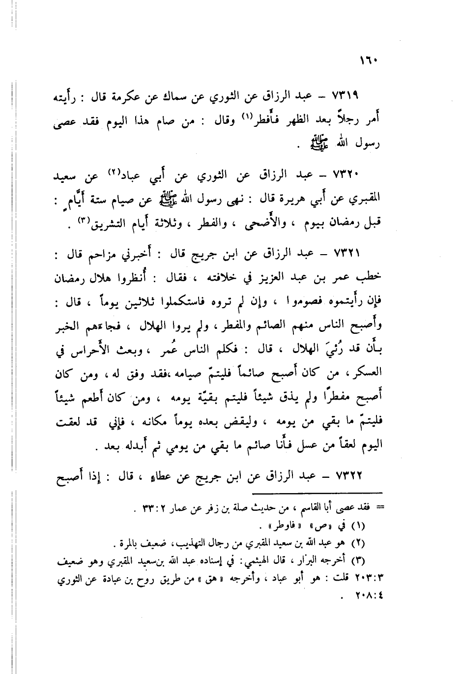 7320 - عَنِ الثَّوْرِيِّ، عَنْ أَبِي عَبَّادٍ، عَنْ سَعِيدٍ الْمَقْبُرِيِّ، عَنْ أَبِي هُرَيْرَةَ قَالَ: «§نَهَى رَسُولُ اللَّهِ صَلَّى اللهُ عَلَيْهِ وَسَلَّمَ عَنْ صِيَامِ سِتَّةِ أَيَّامٍ قَبْلَ رَمَضَانَ بِيَوْمٍ، وَالْأَضْحَى، وَالْفِطْرِ، وَثَلَاثَةِ أَيَّامِ التَّشْرِيقِ»