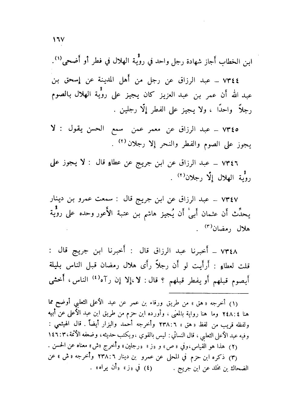 7348 - عَبْدُ الرَّزَّاقِ قَالَ: أَخْبَرَنَا ابْنُ جُرَيْجٍ قَالَ: قُلْتُ لِعَطَاءٍ: أَرَأَيْتَ لَوْ أَنَّ رَجُلًا رَأَى هِلَالَ رَمَضَانَ قَبْلَ النَّاسِ بِلَيْلَةٍ، أَيَصُومُ قَبْلَهُمْ، وَيُفْطِرُ قَبْلَهُمْ؟ قَالَ: «§لَا، إِلَّا إِنْ رَآهُ النَّاسُ أَخْشَى أَنْ يَكُونَ شُبِّهَ عَلَيْهِ حَتَّى يَكُونَا اثْنَيْنِ» قَالَ: قُلْتُ: لَا، إِلَّا رَآهُ، وَسَايَرَهُ سَاعَةً قَالَ: «وَلَوْ حَتَّى يَكُونَا اثْنَيْنِ»