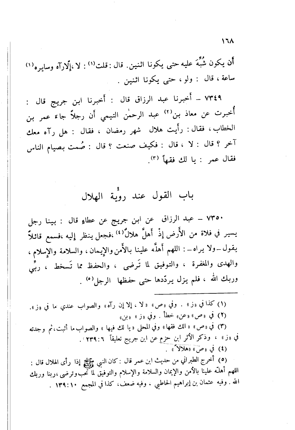 7351 - عَبْدُ الرَّزَّاقِ قَالَ: أَخْبَرَنَا مَعْمَرٌ، عَنْ رَجُلٍ، عَنِ ابْنِ الْمُسَيِّبِ قَالَ: كَانَ النَّبِيُّ صَلَّى اللهُ عَلَيْهِ وَسَلَّمَ إِذَا رَأَى الْهِلَالَ قَالَ: «§آمَنْتُ بَالَّذِي خَلَقَكَ فَسَوَّاكَ فَعَدَلَكَ»