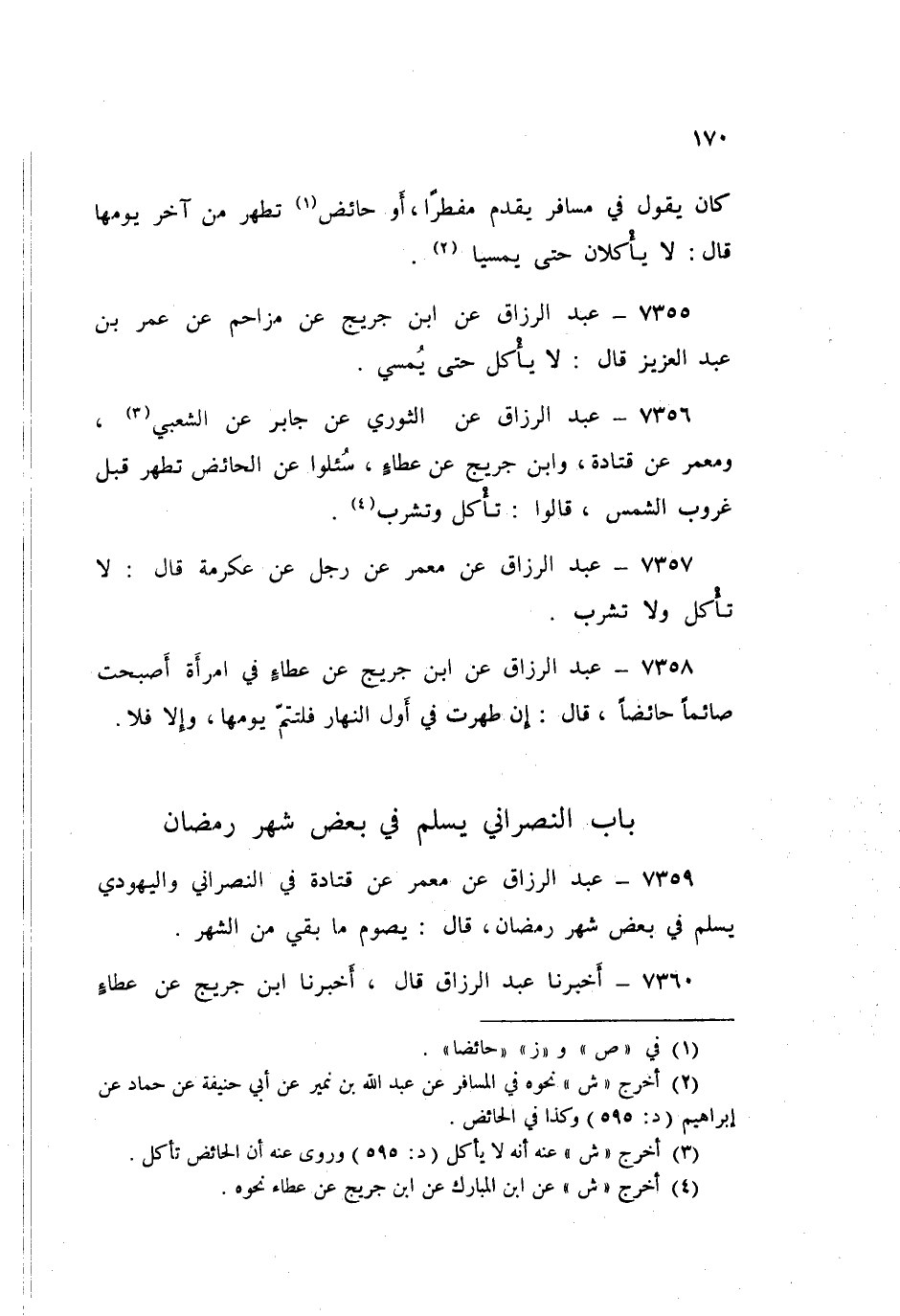 7360 - عَبْدُ الرَّزَّاقِ قَالَ: أَخْبَرَنَا ابْنُ جُرَيْجٍ، عَنْ عَطَاءٍ قَالَ: «§إِنْ أَسْلَمَ النَّصْرَانِيُّ فِي بَعْضِ رَمَضَانَ صَامَ مَا مَضَى مِنْهُ، وَإِنْ أَسْلَمَ فِي آخِرِ النَّهَارِ صَامَ ذَلِكَ الْيَوْمَ»