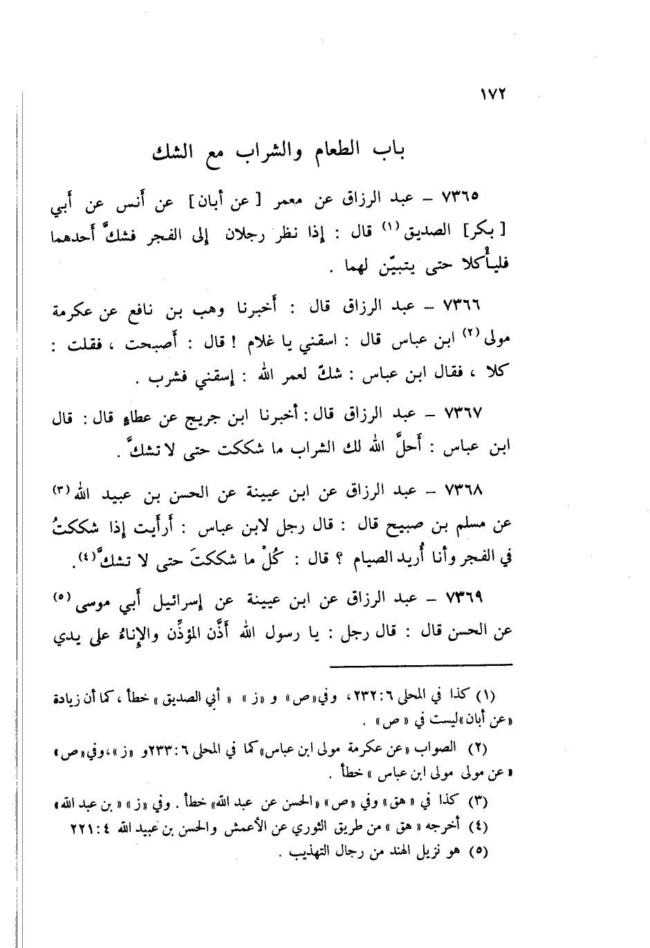 7365 - عَنْ مَعْمَرٍ، عَنْ أَبَانَ، عَنْ أَنَسٍ، عَنْ أَبِي بَكْرٍ الصِّدِّيقِ قَالَ: «§إِذَا نَظَرَ رَجُلَانِ إِلَى الْفَجْرِ، فَشَكَّ أَحَدُهُمَا فَلْيَأْكُلَا حَتَّى يَتَبَيَّنَ لَهُمَا»