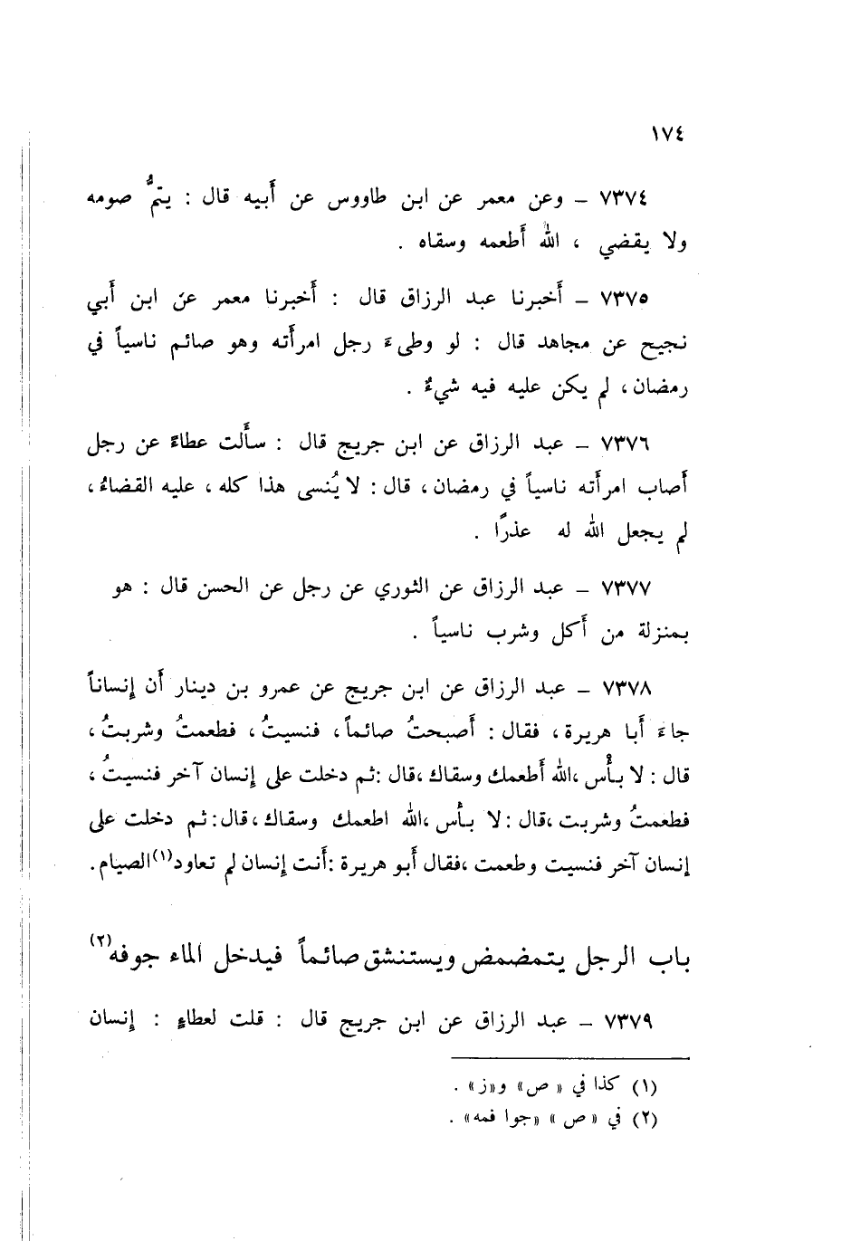 7375 - عَبْدُ الرَّزَّاقِ قَالَ: أَخْبَرَنَا مَعْمَرٌ، عَنِ ابْنِ أَبِي نَجِيحٍ، عَنْ مُجَاهِدٍ قَالَ: «§لَوْ وَطِئَ رَجُلٌ امْرَأَتَهُ، وَهُوَ صَائِمٌ نَاسِيًا فِي رَمَضَانَ لَمْ يَكُنْ عَلَيْهِ فِيهِ شَيْءٌ»