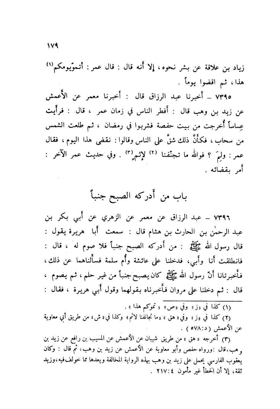 7396 - عَنْ مَعْمَرٍ، عَنِ الزُّهْرِيِّ، عَنْ أَبِي بَكْرِ بْنِ عَبْدِ الرَّحْمَنِ بْنِ الْحَارِثِ بْنِ هِشَامٍ قَالَ: سَمِعْتُ أَبَا هُرَيْرَةَ يَقُولُ: قَالَ رَسُولُ اللَّهِ صَلَّى اللهُ عَلَيْهِ وَسَلَّمَ: مَنْ أَدْرَكَهُ الصُّبْحُ جُنُبًا، فَلَا صَوْمَ لَهُ قَالَ: فَانْطَلَقْتُ أَنَا، وَأَبِي فَدَخَلْنَا عَلَى عَائِشَةَ، وَأُمِّ سَلَمَةَ، فَسَأَلْنَاهُمَا عَنْ ذَلِكَ فَأَخْبَرَتَانَا «أَنَّ رَسُولَ اللَّهِ صَلَّى اللهُ عَلَيْهِ وَسَلَّمَ كَانَ §يُصْبِحُ جُنُبًا مِنْ غَيْرِ حُلْمٍ، ثُمَّ يَصُومُ» قَالَ: ثُمَّ دَخَلْنَا عَلَى مَرْوَانَ، فَأَخْبَرْنَاهُ بِقَوْلِهِمَا، وَقَوْلِ أَبِي هُرَيْرَةَ، فَقَالَ -[180]-: عَزَّمْتُ عَلَيْكُمَا لِمَا ذَهَبْتُمَا إِلَى أَبِي هُرَيْرَةَ، فَأَخْبَرْتُمَاهُ بِقَوْلِهِمَا قَالَ: فَلَقِيَنَا أَبُو هُرَيْرَةَ عِنْدَ بَابِ الْمَسْجِدِ، فَقَالَ لَهُ أَبِي: إِنَّ الْأَمِيرَ عَزَّمَ عَلَيْنَا فِي أَمْرٍ لِنَذْكُرَهُ لَكَ قَالَ: وَمَا هُوَ؟ قَالَ: فَحَدَّثَهُ أَبِي قَالَ: فَتَلَوَّنَ وَجْهُ أَبِي هُرَيْرَةَ، ثُمَّ قَالَ: هَكَذَا حَدَّثَنَا الْفَضْلُ بْنُ الْعَبَّاسِ، وَهُوَ أَعْلَمُ، قَالَ الزُّهْرِيُّ: فَحَوَّلَ الْحَدِيثَ إِلَى غَيْرِهِ