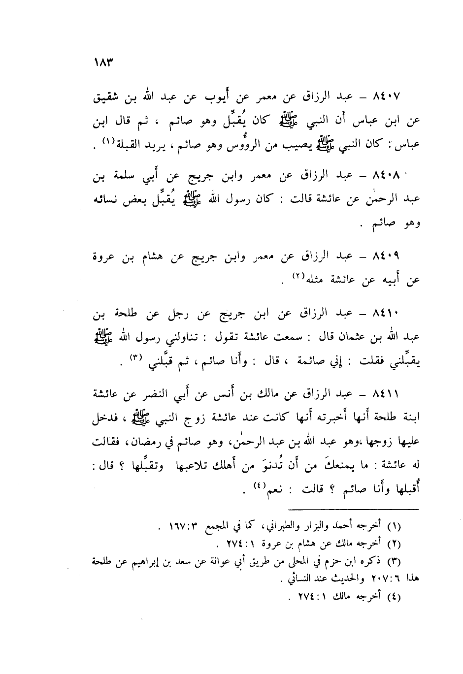 7408 - عَنْ مَعْمَرٍ، وَابْنُ جُرَيْجٍ، عَنْ أَبِي سَلَمَةَ بْنِ عَبْدِ الرَّحْمَنِ، عَنْ عَائِشَةَ قَالَتْ: «كَانَ رَسُولُ اللَّهِ صَلَّى اللهُ عَلَيْهِ وَسَلَّمَ §يُقَبِّلُ بَعْضَ نِسَائِهِ، وَهُوَ صَائِمٌ»، عَبْدُ الرَّزَّاقِ،