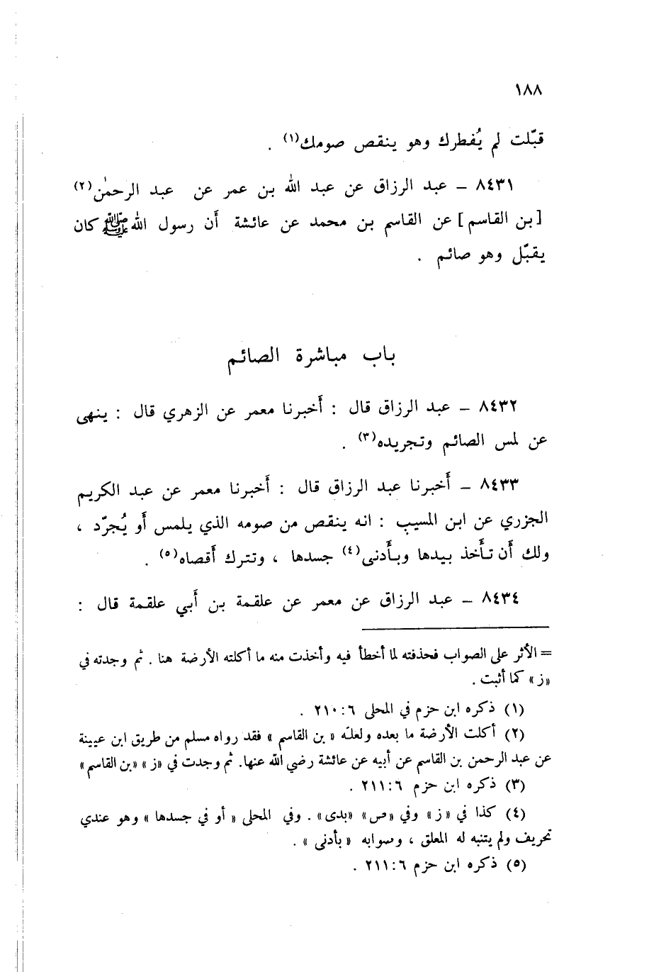 7433 - عَبْدُ الرَّزَّاقِ قَالَ: أَخْبَرَنَا مَعْمَرٌ، عَنْ عَبْدِ الْكَرِيمِ الْجَزَرِيِّ، عَنِ ابْنِ الْمُسَيِّبِ: «أَنَّهُ §يُنْقِصُ مِنْ صَوْمِهِ الَّذِي يَلْمَسُ أَوْ يُجَرِّدُ، وَلَكَ أَنْ تَأْخُذَ بِيَدِهَا، وَبِأَدْنَى جَسَدِهَا، وَتَتَرُكُ أَقْصَاهُ»