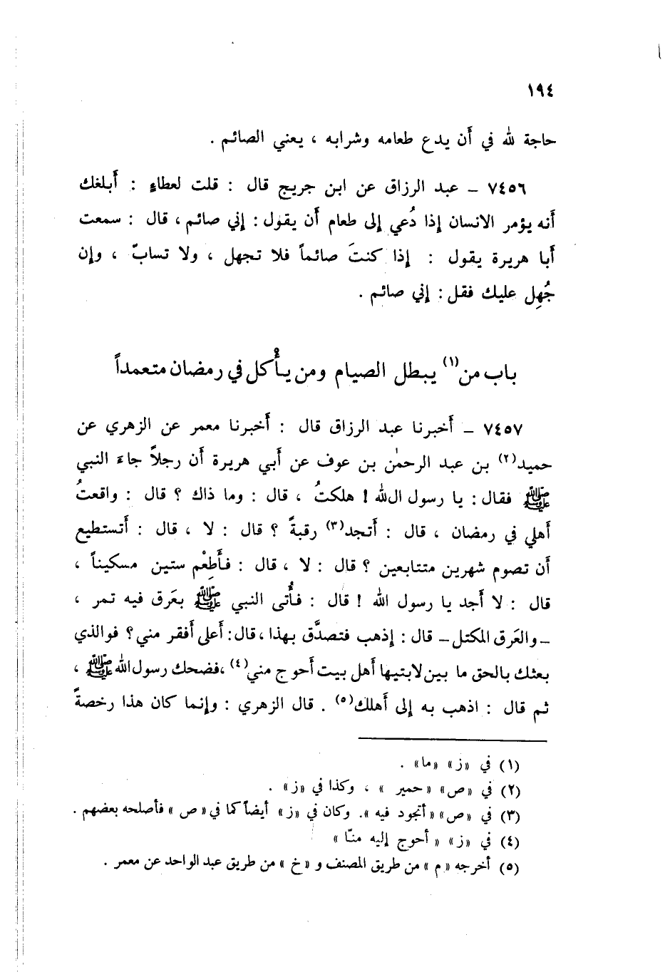 7457 - أَخْبَرَنَا عَبْدُ الرَّزَّاقِ قَالَ: أَخْبَرَنَا مَعْمَرٌ، عَنِ الزُّهْرِيِّ، عَنْ حُمَيْدِ بْنِ عَبْدِ الرَّحْمَنِ بْنِ عَوْفٍ، عَنْ أَبِي هُرَيْرَةَ، أَنَّ رَجُلًا جَاءَ النَّبِيَّ صَلَّى اللهُ عَلَيْهِ وَسَلَّمَ، فَقَالَ: يَا رَسُولَ اللَّهِ ، هَلَكْتُ قَالَ: «وَمَا ذَاكَ؟» قَالَ: وَاقَعْتُ أَهْلِي فِي رَمَضَانَ قَالَ: «أَتَجِدُ رَقَبَةً» قَالَ: لَا قَالَ: «§أَتَسْتَطِيعُ أَنْ تَصُومَ شَهْرَيْنِ مُتَتَابِعَيْنِ؟» قَالَ: لَا قَالَ: «فَأَطْعِمْ سِتِّينَ مِسْكِينًا» قَالَ: لَا أَجِدُ يَا رَسُولَ اللَّهِ قَالَ: " فَأَتَى النَّبِيُّ صَلَّى اللهُ عَلَيْهِ وَسَلَّمَ بَعَرَقٍ، فِيهِ تَمْرٌ - وَالْعَرَقُ الْمِكْتَلُ - قَالَ: اذْهَبْ فَتَصَدَّقْ بِهَذَا " قَالَ: أَعَلَى أَفْقَرَ مِنِّي، فَوَالَّذِي بَعَثَكَ بَالْحَقِّ، مَا بَيْنَ لَابَتَيْهَا أَهْلُ بَيْتٍ أَحْوَجُ مِنِّي، فَضَحِكَ رَسُولُ اللَّهِ صَلَّى اللهُ عَلَيْهِ وَسَلَّمَ، ثُمَّ قَالَ: «اذْهَبْ بِهِ إِلَى أَهْلِكَ»، قَالَ الزُّهْرِيُّ: «وَإِنَّمَا كَانَ هَذَا رُخْصَةً -[195]- لِلرَّجُلِ خَاصَّةً، وَلَوْ أَنَّ رَجُلًا فَعَلَ ذَلِكَ الْيَوْمَ لَمْ يَكُنْ بُدٌّ مِنَ التَّكْفِيرِ»