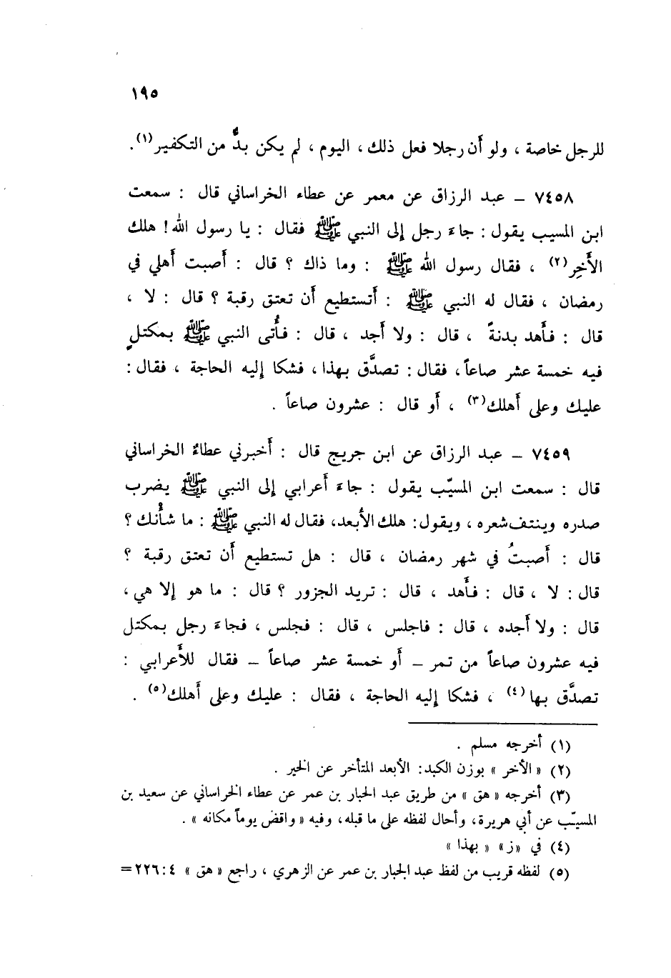 7459 - عَنِ ابْنِ جُرَيْجٍ قَالَ: أَخْبَرَنِي عَطَاءٌ الْخُرَاسَانِيُّ قَالَ: سَمِعْتُ ابْنَ الْمُسَيِّبِ يَقُولُ: جَاءَ أَعْرَابِيٌّ إِلَى النَّبِيِّ صَلَّى اللهُ عَلَيْهِ وَسَلَّمَ يَضْرِبُ صَدْرَهُ، وَيَنْتِفُ شَعْرَهُ، وَيَقُولُ: هَلَكَ الْأَبْعَدُ، فَقَالَ لَهُ النَّبِيُّ صَلَّى اللهُ عَلَيْهِ وَسَلَّمَ: «مَا شَأْنُكَ؟» قَالَ: أَصَبْتُ فِي شَهْرِ رَمَضَانَ قَالَ: «§هَلْ تَسْتَطِيعُ أَنْ تُعْتِقَ رَقَبَةً؟» قَالَ: لَا قَالَ: «فَأَهْدِ» قَالَ: تُرِيدُ الْجُزُورَ؟ قَالَ: «مَا هُوَ إِلَّا هِيَ» قَالَ: وَلَا أَجِدُهُ قَالَ: «فَاجْلِسْ» قَالَ: فَجَلَسَ فَجَاءَ رَجُلٌ بِمِكْتَلٍ فِيهِ عِشْرُونَ صَاعًا مِنْ تَمْرٍ، أَوْ خَمْسَةَ عَشَرَ صَاعًا، فَقَالَ لِلْأَعْرَابِيِّ: «تَصَدَّقْ بِهَا»، فَشَكَا إِلَيْهِ الْحَاجَةَ، فَقَالَ: «عَلَيْكَ، وَعَلَى أَهْلِكَ»