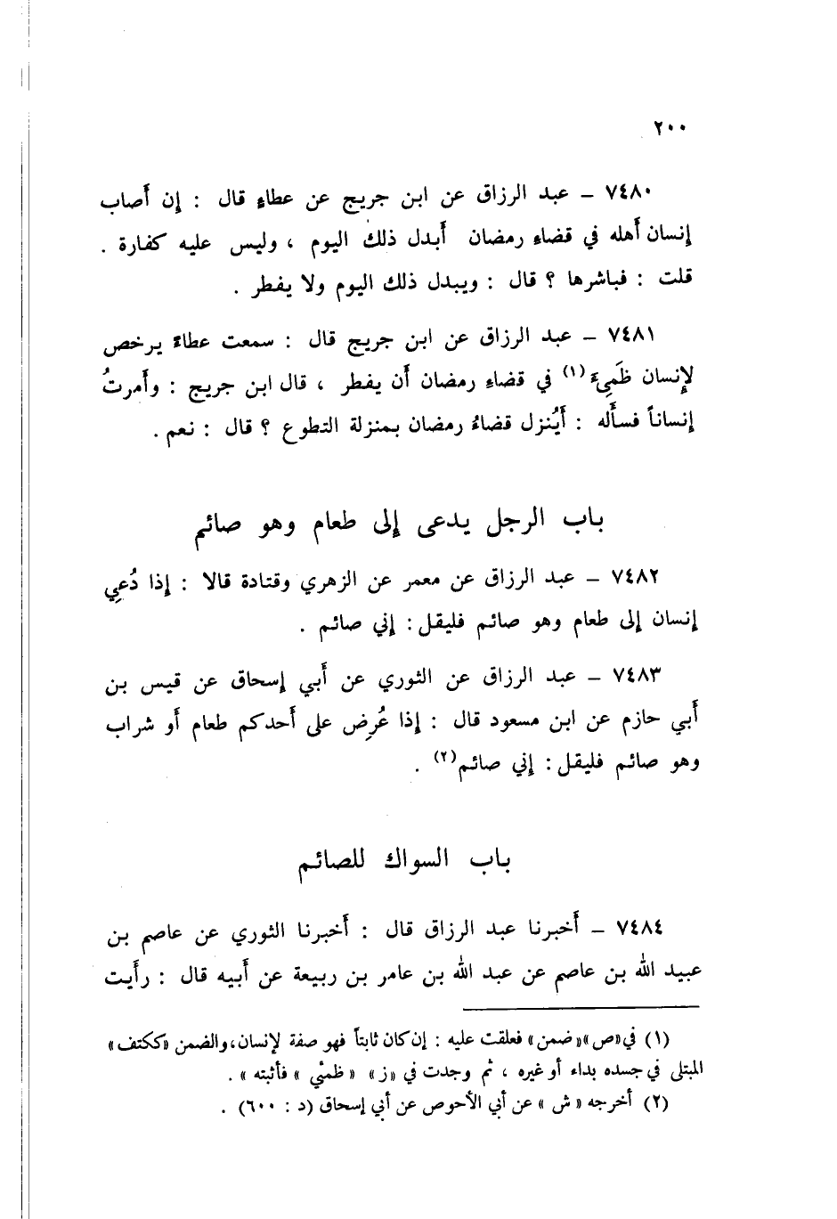 7484 - عَبْدُ الرَّزَّاقِ قَالَ: أَخْبَرَنَا الثَّوْرِيُّ، عَنْ عَاصِمِ بْنِ عُبَيْدِ اللَّهِ بْنِ عَاصِمٍ، عَنْ عَبْدِ اللَّهِ بْنِ عَامِرِ بْنِ رَبِيعَةَ، عَنْ أَبِيهِ قَالَ: «رَأَيْتُ رَسُولَ اللَّهِ صَلَّى اللهُ عَلَيْهِ وَسَلَّمَ §يَسْتَاكُ، وَهُوَ صَائِمٌ مَا لَا أُحْصِي»