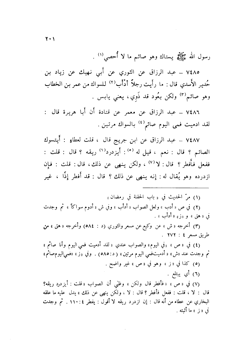 7487 - عَنِ ابْنِ جُرَيْجٍ قَالَ: قُلْتُ لِعَطَاءٍ: §أَيَتَسَوَّكُ الصَّائِمُ؟ قَالَ: «نَعَمْ»، قِيلَ لَهُ: أَيَزْدَرِدْ رِيقَهُ؟ قَالَ: قُلْتُ: فَفَعَلَ فَأَفْطَرَ؟ قَالَ: «لَا، وَلَكِنْ يُنْهَى عَنْ ذَلِكَ» قَالَ: قُلْتُ: فَإِنِ ازْدَرَدَهُ، وَهُوَ يُقَالُ لَهُ: إِنَّهُ يُنْهَى عَنْ ذَلِكَ؟ قَالَ: «قَدْ أَفْطَرَ إِذَا غَيْرَ مَرَّةٍ يَقُولُ ذَلِكَ»