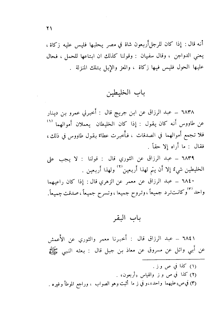 6841 - قَالَ: أَخْبَرَنَا مَعْمَرٌ، وَالثَّوْرِيُّ، عَنِ الْأَعْمَشِ، عَنْ أَبِي وَائِلٍ، عَنْ مَسْرُوقٍ، عَنْ مُعَاذَ بْنِ جَبَلٍ قَالَ: بَعَثَهُ النَّبِيُّ صَلَّى اللهُ عَلَيْهِ وَسَلَّمَ إِلَى الْيَمَنِ «فَأَمَرَهُ أَنْ §يَأْخُذَ مِنْ كُلِّ ثَلَاثِينَ بَقَرَةً تَبِيعًا أَوْ تَبِيعَةً، وَمِنْ كُلِّ أَرْبَعِينَ مُسِنَّةً، وَمِنْ كُلِّ حَالِمْ دِينَارًا، أَوْ عَدْلَهُ مُعَافِرًا»