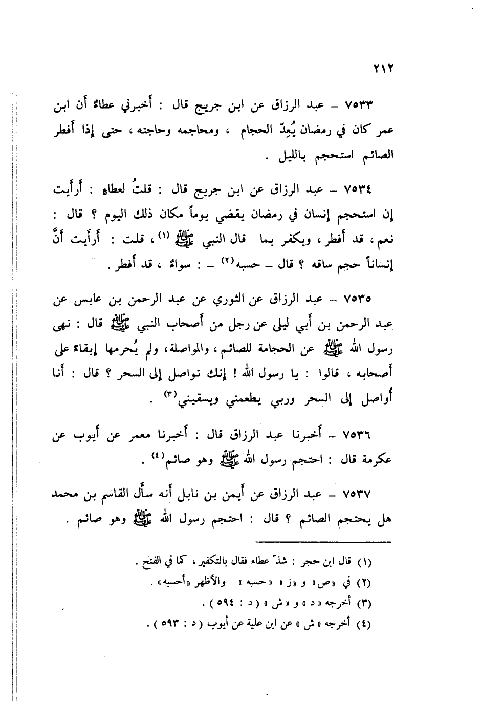 7536 - عَبْدُ الرَّزَّاقِ قَالَ: أَخْبَرَنَا مَعْمَرٌ، عَنْ أَيُّوبَ، عَنْ عِكْرِمَةَ قَالَ: «§احْتَجَمَ رَسُولُ اللَّهِ صَلَّى اللهُ عَلَيْهِ وَسَلَّمَ وَهُوَ صَائِمٌ»