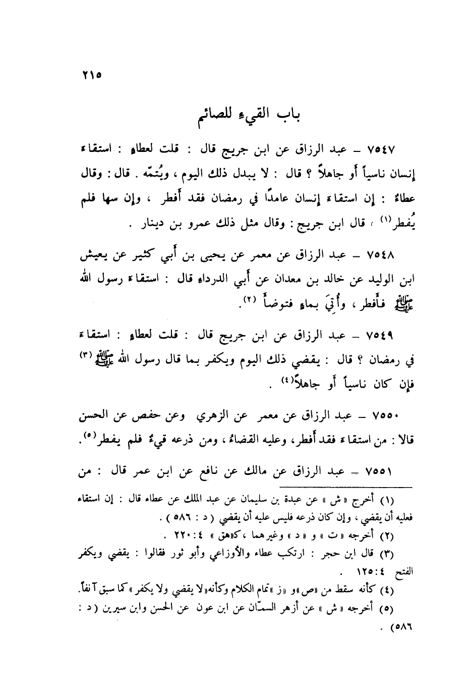 7547 - عَنِ ابْنِ جُرَيْجٍ قَالَ: قُلْتُ لِعَطَاءٍ: اسْتَقَاءَ إِنْسَانٌ نَاسِيًا، أَوْ جَاهِلًا قَالَ: «لَا يُبْدِلُ ذَلِكَ الْيَوْمَ، وَيُتِمُّهُ» قَالَ: وَقَالَ عَطَاءٌ: «إِنِ §اسْتَقَاءَ إِنْسَانٌ عَامِدًا فِي رَمَضَانَ فَقَدْ أَفْطَرَ، وَإِنْ سَهَا فَلَمْ يُفْطِرْ» قَالَ ابْنُ جُرَيْجٍ وَقَالَ مِثْلَ ذَلِكَ عَمْرُو بْنُ دِينَارٍ