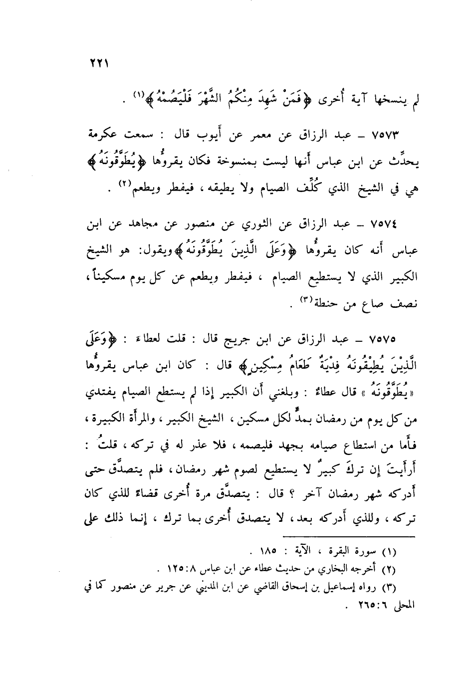7574 - عَنِ الثَّوْرِيِّ، عَنْ مَنْصُورٍ، عَنْ مُجَاهِدٍ، عَنِ ابْنِ عَبَّاسٍ أَنَّهُ كَانَ يَقْرَؤُهَا: «وَعَلَى الَّذِينَ يُطَوَّقُونَهُ»، وَيَقُولُ: «§هُوَ الشَّيْخُ الْكَبِيرُ الَّذِي لَا يَسْتَطِيعُ الصِّيَامَ فَيُفْطِرُ، وَيُطْعِمُ عَنْ كُلِّ يَوْمٍ مِسْكِينًا نِصْفَ صَاعٍ مِنْ حِنْطَةٍ»