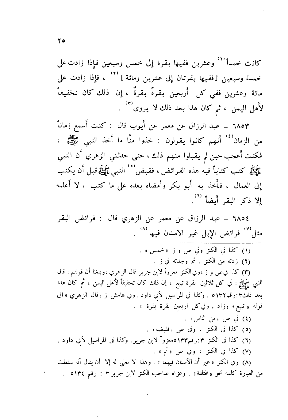 6854 - عَنْ مَعْمَرٍ، عَنِ الزُّهْرِيِّ قَالَ: «§فَرَائِضُ الْبَقَرِ مِثْلُ فَرَائِضِ الْإِبِلِ غَيْرَ الْأَسْنَانِ فِيهَا»