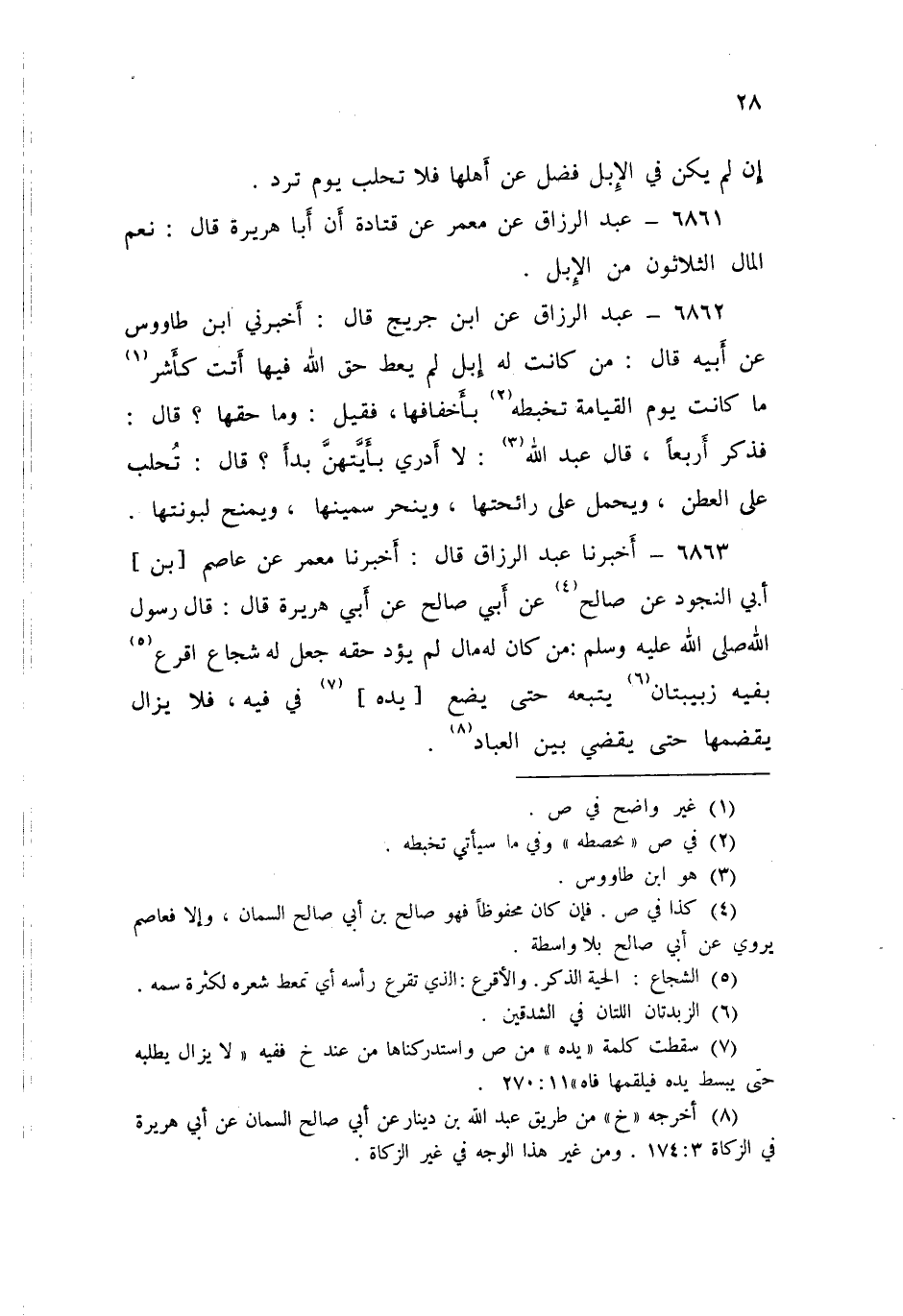 6863 - عَبْدُ الرَّزَّاقِ قَالَ: أَخْبَرَنَا مَعْمَرٌ، عَنْ عَاصِمِ بْنِ أَبِي النَّجُودِ، عَنْ صَالِحٍ، عَنْ أَبِي صَالِحٍ، عَنْ أَبِي هُرَيْرَةَ قَالَ: قَالَ رَسُولُ اللَّهِ صَلَّى اللهُ عَلَيْهِ وَسَلَّمَ: «§مَنْ كَانَ لَهُ مَالٌ لَمْ يُؤَدِّ حَقَّهُ جُعِلَ لَهُ شُجَاعٌ أَقَرْعُ بِفِيهِ زَبِيبَتَانِ يَتْبَعُهُ حَتَّى يَضَعَ يَدَهُ فِي فِيهِ، فَلَا يَزَالُ يَقْضِمُهَا حَتَّى يُقْضَى بَيْنَ الْعِبَادِ»