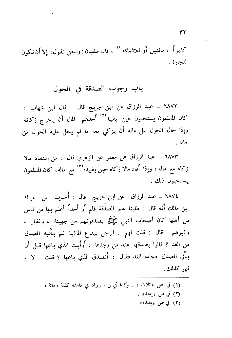 6872 - عَنِ ابْنِ جُرَيْجٍ قَالَ: قَالَ ابْنُ شِهَابٍ: «كَانَ §الْمُسْلِمُونَ يَسْتَحِبُّونَ حِينَ يُفِيدُ أَحَدُهُمُ الْمَالَ أَنْ يُخْرِجَ زَكَاتَهُ، وَإِذَا حَالَ الْحَوْلُ عَلَى مَالِهِ أَنْ يُزَكِّيَ مَعَهُ مَا لَمْ يَحُلْ عَلَيْهِ الْحَوْلُ مِنْ مَالِهِ»