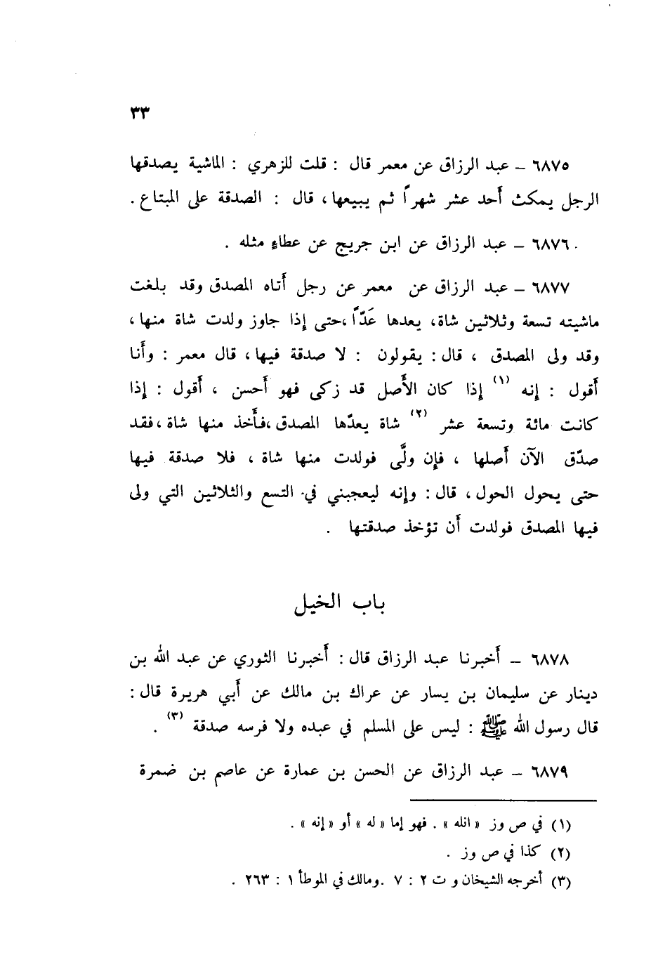6877 - عَنْ مَعْمَرٍ، عَنْ رَجُلٍ أَتَاهُ الْمُصَدِّقُ، وَقَدْ بَلَغَتْ مَاشِيَتُهُ تِسْعَةً وَثَلَاثِينَ شَاةً يَعُدُّهَا عَدًّا حَتَّى إِذَا جَاوَزَ وَلَدَتْ شَاةٌ مِنْهَا، وَقَدْ وَلَّى الْمُصَدِّقُ قَالَ: يَقُولُونَ: «لَا صَدَقَةَ فِيهَا» قَالَ مَعْمَرٌ: «وَأَنَا أَقُولُ أَنَّهُ إِذَا كَانَ الْأَصْلُ قَدْ زَكَّى فَهُوَ أَحْسَنُ»، أَقُولُ: «§إِذَا كَانَتْ مِائَةً وَتِسْعَةَ عَشْرَ شَاةً يَعُدُّهَا الْمُصَدِّقُ فَأَخَذَ مِنْهَا شَاةً، فَقَدَ صَدَّقَ الْآنَ أَصْلُهَا، فَإِنْ وَلَّى فَوَلَدَتْ مِنْهَا شَاةٌ، فَلَا صَدَقَةَ فِيهَا حَتَّى يَحُولَ الْحَوْلُ» قَالَ: «وَإِنَّهُ لَيُعْجِبُنِي فِي التِّسْعِ وَالثَّلَاثِينَ الَّتِي وَلَّى فِيهَا الْمُصَدِّقُ، فَوَلَدَتْ أَنْ تُؤْخَذَ صَدَقَتُهَا»