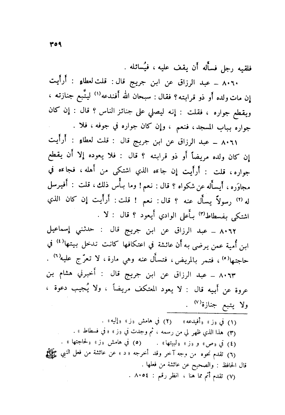 8063 - عَنِ ابْنِ جُرَيْجٍ قَالَ: أَخْبَرَنِي هِشَامُ بْنُ عُرْوَةَ، عَنْ أَبِيهِ، قَالَ: «§لَا يَعُودُ الْمُعْتَكِفُ مَرِيضًا، وَلَا يُجِيبُ دَعْوَةً، وَلَا يَتْبَعُ جِنَازَةً»