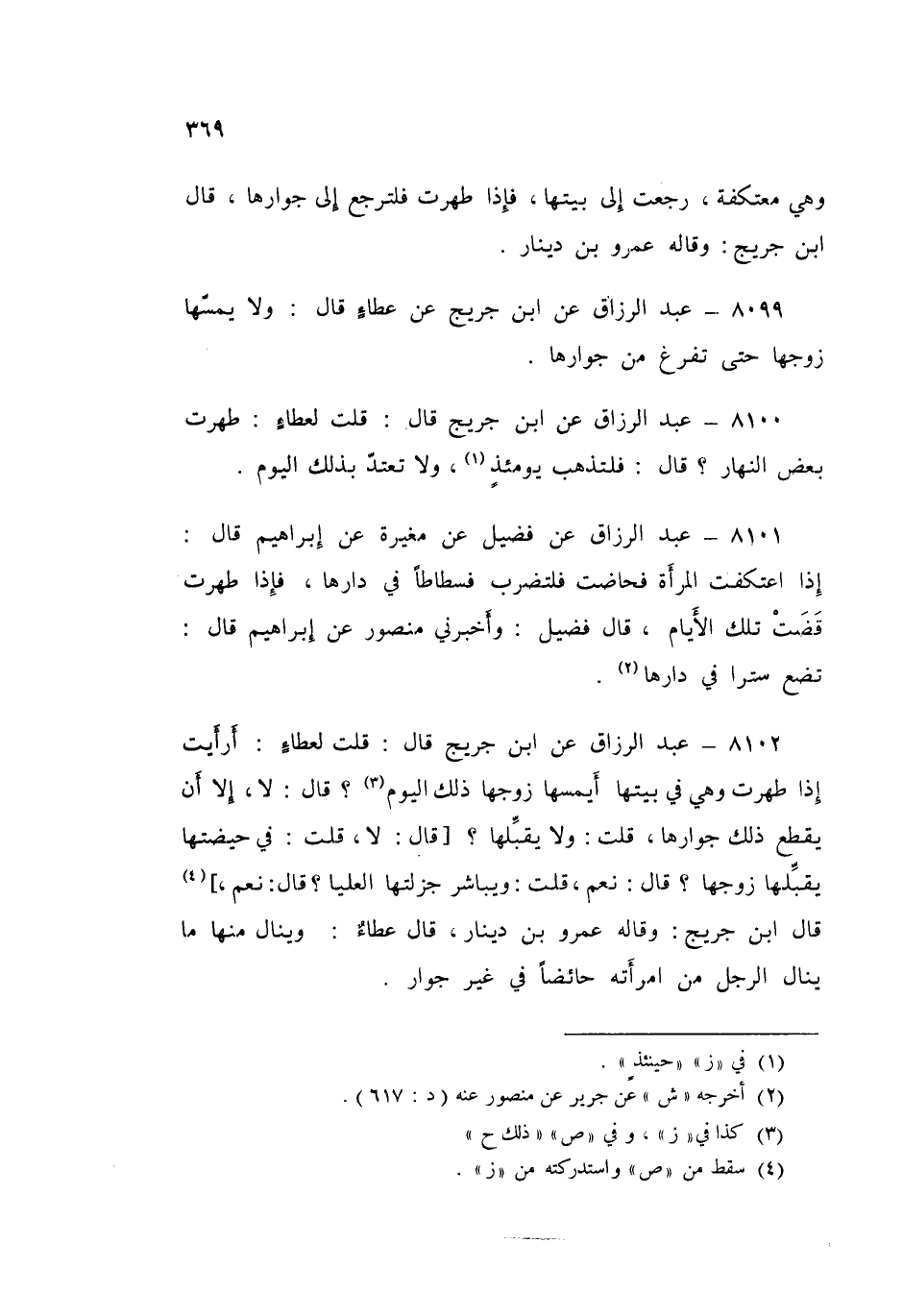 8102 - عَنِ ابْنِ جُرَيْجٍ قَالَ: قُلْتُ لِعَطَاءٍ: أَرَأَيْتَ §إِذَا طَهُرَتْ، وَهِيَ فِي بَيْتِهَا أَيَمَسُّهَا زَوْجُهَا ذَلِكَ الْيَوْمَ؟ قَالَ: «لَا، إِلَّا أَنْ يَقْطَعَ ذَلِكَ جِوَارَهَا»، قُلْتُ: وَلَا يُقَبِّلُهَا؟ قَالَ: «لَا»، قُلْتُ: فِي حَيْضَتِهَا يُقَبِّلُهَا زَوْجُهَا؟ قَالَ: «نَعَمْ»، قُلْتُ: وَيُبَاشِرُ جَزْلَتَهَا العُلْيَا؟ قَالَ: «نَعَمْ» قَالَ ابْنُ جُرَيْجٍ: وَقَالَهُ عَمْرُو بْنُ دِينَارٍ، قَالَ عَطَاءٌ: «وَيَنَالُ مِنْهَا مَا يَنَالُ الرَّجُلُ مِنَ امْرَأَتِهِ حَائِضًا فِي غَيْرِ جِوَارٍ»